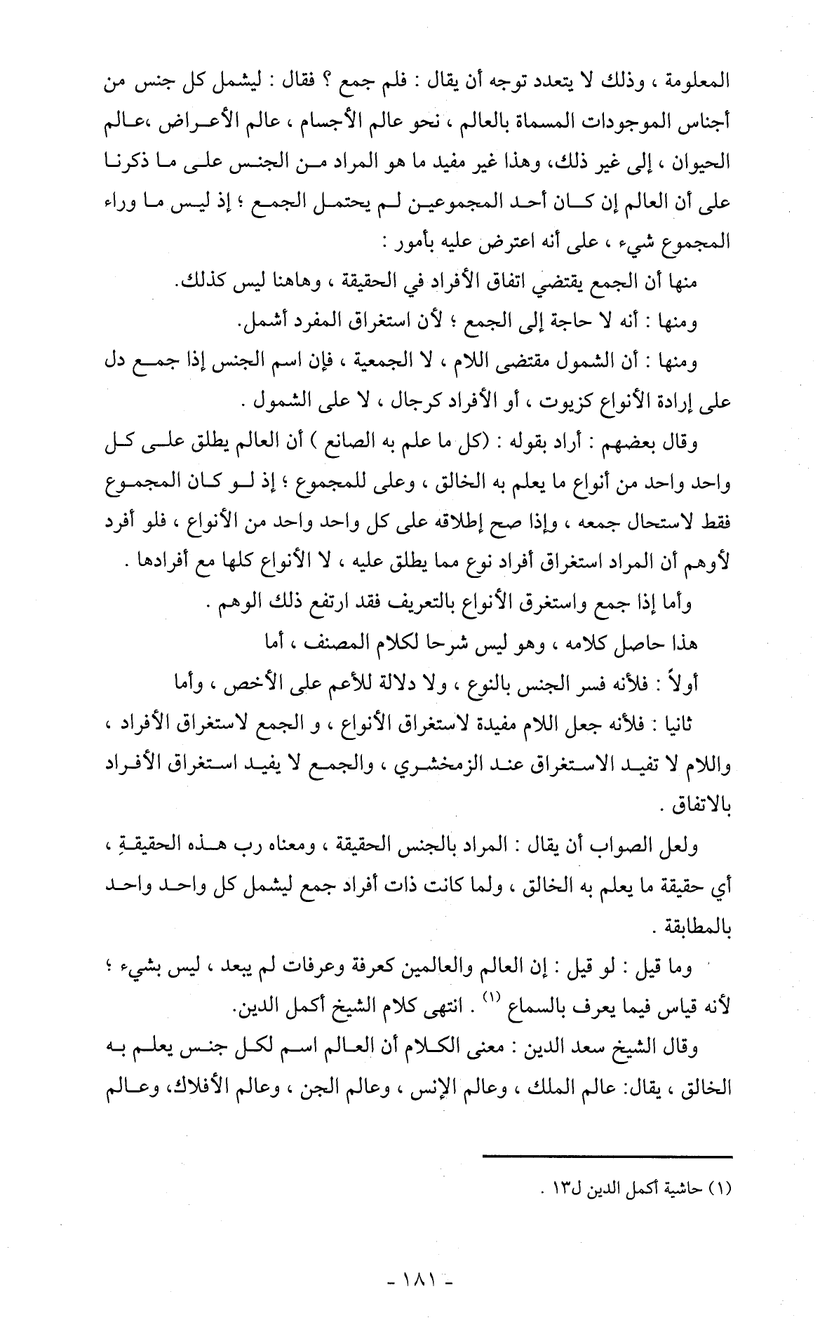 المعلومة، وذلك لا يتعدد توجه أن يقال: فلم جمع؟ فقال: ليشمل كل جنس من أجناس الموجودات المسماة بالعالم، نحو عالم الأجسام، عالم الأعراض، عالم الحيوان، إلى غير ذلك، وهذا غير مفيد ما هو المراد من الجنس على ما ذكرنا على أن العالم إن كان أحد المجموعين لم يحتمل الجمع؛ إذ ليس ما وراء المجموع شيء، على أنه اعترض عليه بأمور: