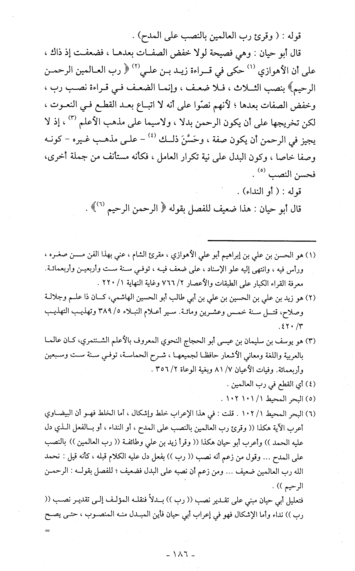 قال أبو حيان: وهي فصيحة لولا خفض الصفات بعدها، فضعفت إذ ذاك، على أن الأهوازي (1) حكى في قراءة زيد بن علي (2) (رب العالمين الرحمن الرحيم) بنصب الثلاث، فلا ضعف، وإنما الضعف في قراءة نصب رب، وخفض الصفات بعدها؛ لأنهم تصّوا على أنه لا اتباع بعد القطع في النعوت، لكن تخريجها على أن يكون الرحمن بدلا، ولا سيما على مذهب الأعلم (3)؛ إذ لا يجيز في الرحمن أن يكون صفة، وحَسَّنَ ذلك (4) - على مذهب غيره - كونه وصفا خاصا، وكون البدل على نية تكرار العامل، فكأنَّه مستأنف من جملة أخرى، فحسن النصب (5).