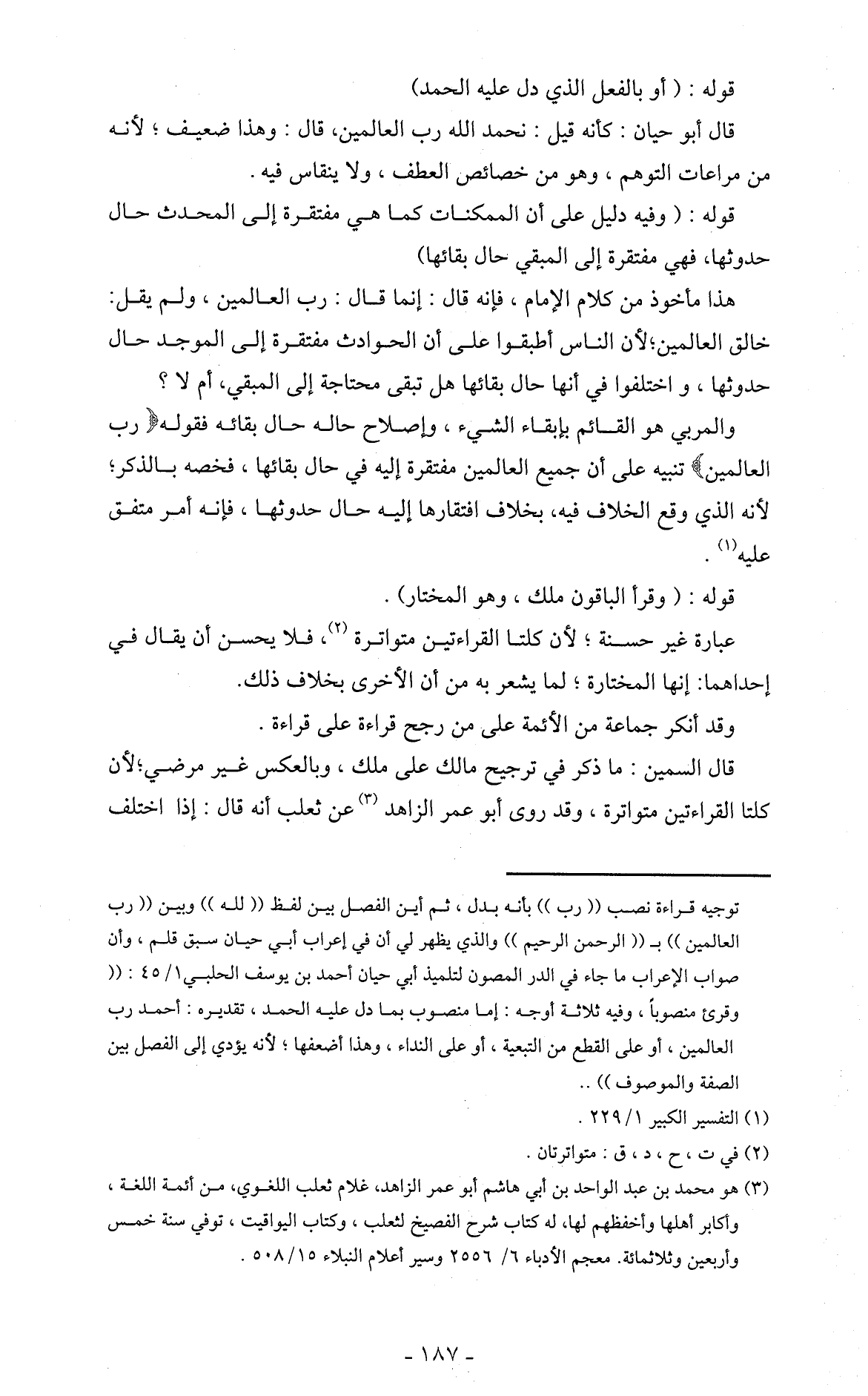 هذا مأخوذ من كلام الإمام، فإنه قال: إنما قال: رب العالمين، ولم يقل: خالق العالمين؛ لأن الناس أطبقوا على أن الحوادث مفتقرة إلى الموجد حال حدوثها، واختلفوا في أنها حال بقائها هل تبقى محتاجة إلى المبقي، أم لا؟