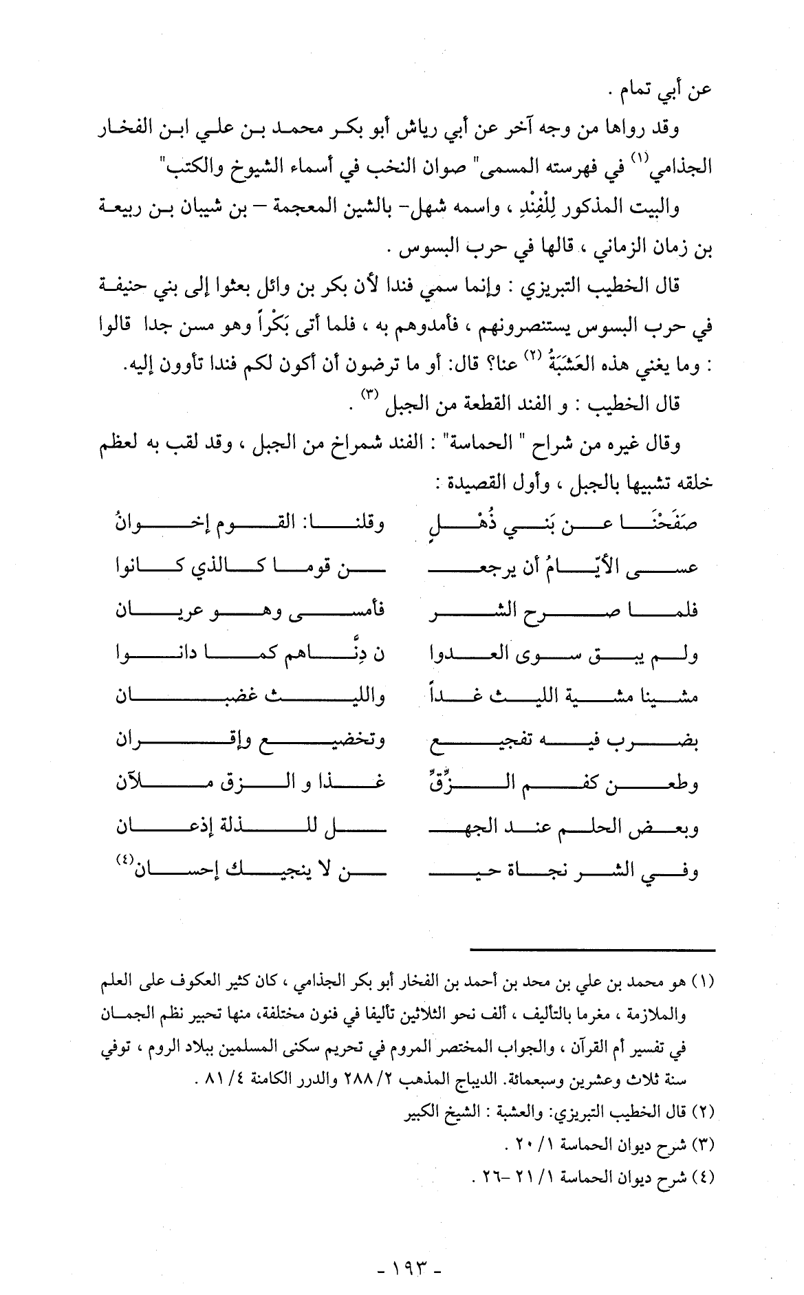 وقال غيره من شراح " الحماسة ": الفند شمراخ من الجبل، وقد لقب به لعظم خلقه تشبيها بالجبل، وأول القصيدة: