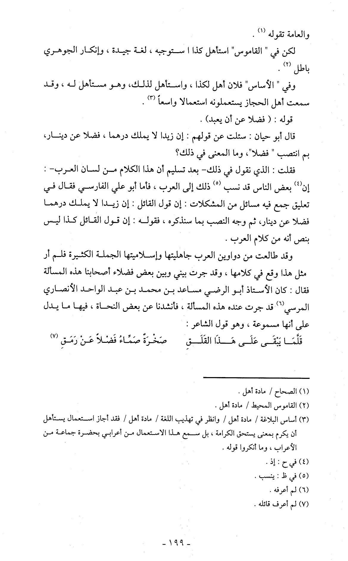 فقلت: الذي نقول في ذلك - بعد تسليم أن هذا الكلام من لسان العرب -: إن (4) بعض الناس قد نسب (5) ذلك إلى العرب، فأمَّا أبو علي الفارسي فقال في تعليق جمع فيه مسائل من المشكلات: إن قول القائل: إن زيدا لا يملك درهما فضلا عن دينار، ثم وجه النصب بما سنذكره، فقوله: إن قول القائل كذا ليس بنص أنه من كلام العرب.