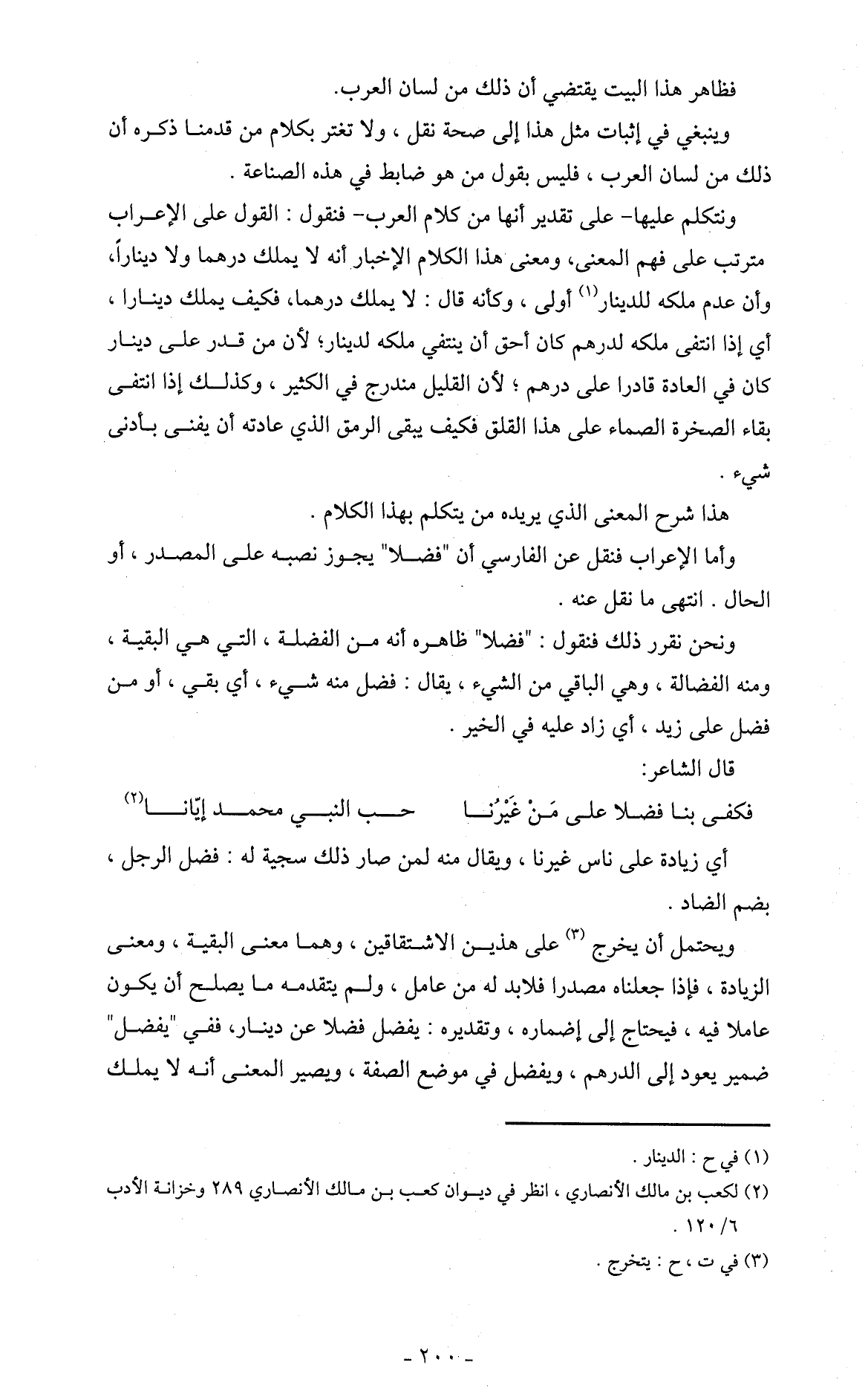 ويحتمل أن يخرج (3) على هذين الاشتقاقين، وهما معنى البقية، ومعنى الزيادة، فإذا جعلناه مصدرا فلابد له من عامل، ولم يتقدمه ما يصلح أن يكون عاملا فيه، فيحتاج إلى إضماره، وتقديره: يفضل فضلا عن دينار، ففي " يفضل " ضمير يعود إلى الدرهم، ويفضل في موضع الصفة، ويصير المعنى أنه لا يملك