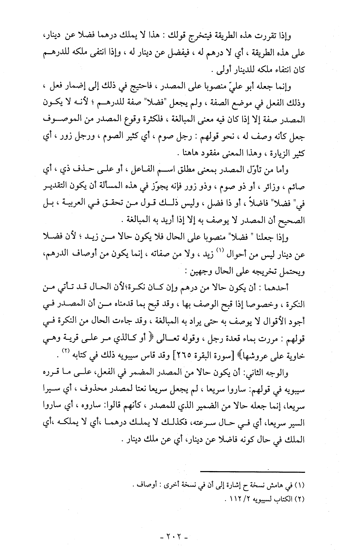 وإنما جعله أبو عليّ منصوبا على المصدر، فاحتيج في ذلك إلى إضمار فعل، وذلك الفعل في موضع الصفة، ولم يجعل " فضلا " صفة للدرهم؛ لأنه لا يكون المصدر صفة إلا إذا كان فيه معنى المبالغة، فلكثرة وقوع المصدر من الموصوف جعل كأنه وصف له، نحو قولهم: رجل صوم، أي كثير الصوم، ورجل زور، أي كثير الزيارة، وهذا المعنى مفقود هاهنا.