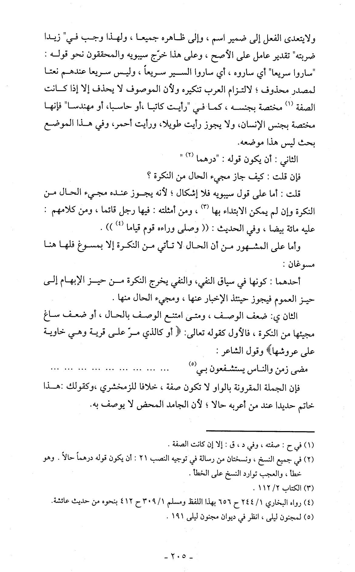 ولا يتعدى الفعل إلى ضمير اسم، وإلى ظاهره جميعا، ولهذا وجب في " زيدا ضربته " تقدير عامل على الأصح، وعلى هذا خرّج سيبويه والمحققون نحو قوله: " ساروا سريعا " أي ساروه، أي ساروا السير سريعاً، وليس سريعا عندهم نعتا لمصدر محذوف، لالتزام العرب تنكيره ولأن الموصوف لا يحذف إلا إذا كانت الصفة (1) مختصة بجنسه، كما في " رأيت كاتبا، أو حاسبا، أو مهندسا " فإنها مختصة بجنس الإنسان، ولا يجوز رأيت طويلا، ورأيت أحمر، وفي هذا الموضع بحث ليس هذا موضعه.
