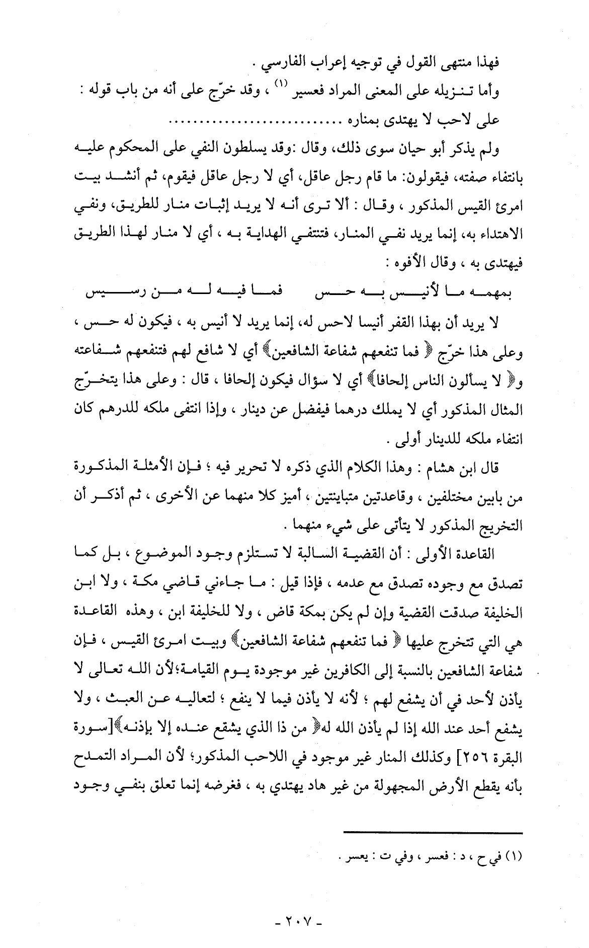 القاعدة الأولى: أن القضية السالبة لا تستلزم وجود الموضوع، بل كما تصدق مع وجوده تصدق مع عدمه، فإذا قيل: ما جاءني قاضي مكة، ولا ابن الخليفة صدقت القضية وإن لم يكن بمكة قاض، ولا للخليفة ابن، وهذه القاعدة هي التي تتخرج عليها (فما تنفعهم شفاعة الشافعين) وبيت امرئ القيس، فإن شفاعة الشافعين بالنسبة إلى الكافرين غير موجودة يوم القيامة؛ لأن الله تعالى لا يأذن لأحد في أن يشفع لهم؛ لأنه لا يأذن فيما لا ينفع؛ لتعاليه عن العبث، ولا يشفع أحد عند الله إذا لم يأذن الله له (من ذا الذي يشقع عنده إلا بإذنه) [سورة البقرة 256] وكذلك المنار غير موجود في اللاحب المذكور؛ لأن المراد التمدح بأنه يقطع الأرض المجهولة من غير هاد يهتدي به، فغرضه إنما تعلق بنفي وجود