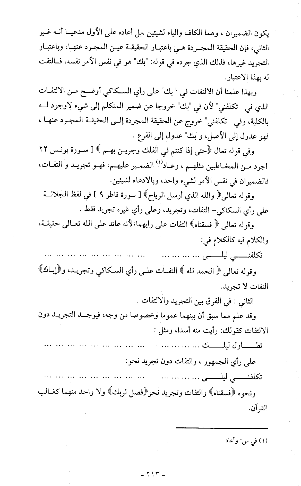 وفي قوله تعالى (حَتَّى إِذَا كُنْتُمْ فِي الْفُلْكِ وَجَرَيْنَ بِهِمْ) [سورة يونس 22] جرد من المخاطبين مثلهم، وعاد (1) الضمير عليهم، فهو تجريد والتفات، فالضميران في نفس الأمر لشيء واحد، وبالادعاء لشيئين.