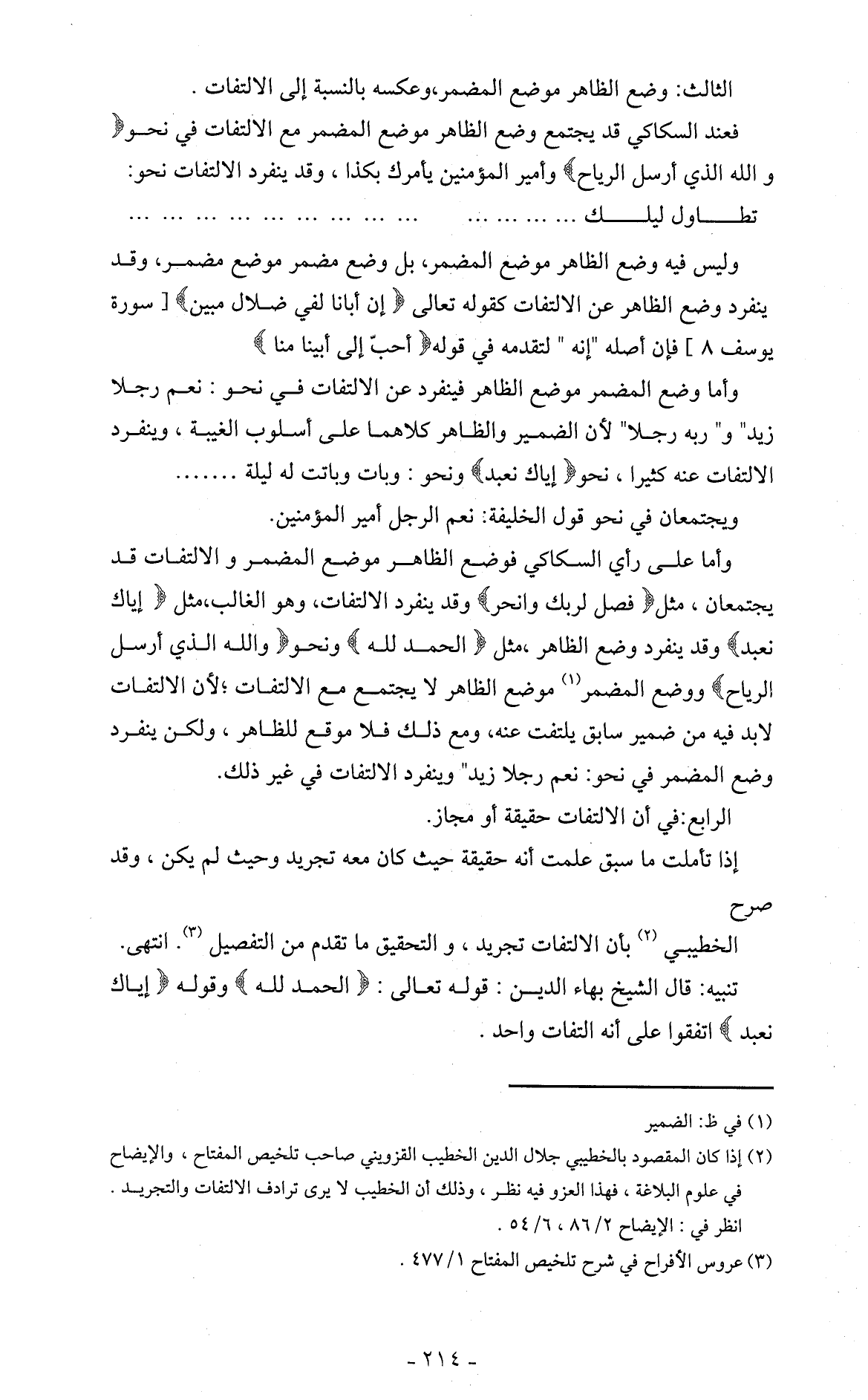 وأما على رأي السكاكي فوضع الظاهر موضع المضمر والالتفات قد يجتمعان، مثل (فصل لربك وانحر) وقد ينفرد الالتفات، وهو الغالب، مثل (إياك نعبد) وقد ينفرد وضع الظاهر، مثل (الحمد لله) ونحو (والله الذي أرسل الرياح) ووضع المضمر (1) موضع الظاهر لا يجتمع مع الالتفات؛ لأن الالتفات لابد فيه من ضمير سابق يلتفت عنه، ومع ذلك فلا موقع للظاهر، ولكن ينفرد وضع المضمر في نحو: نعم رجلا زيد " وينفرد الالتفات في غير ذلك.