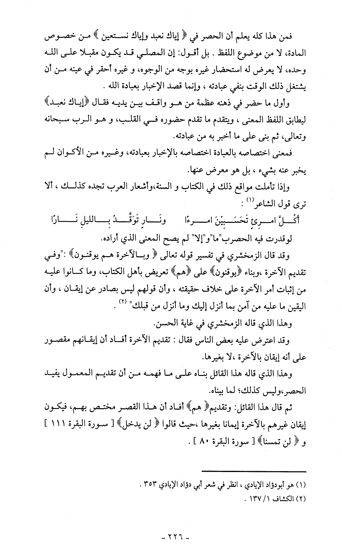 فمن هذا كله يعلم أن الحصر في (إِيَّاكَ نَعْبُدُ وَإِيَّاكَ نَسْتَعِينُ) من خصوص المادة، لا من موضوع اللفظ. بل أقول: إن المصلي قد يكون مقبلا على الله وحده، لا يعرض له استحضار غيره بوجه من الوجوه، وغيره أحقر في عينه من أن يشتغل ذلك الوقت بنفي عبادته، وإنما قصد الإخبار بعبادة الله.