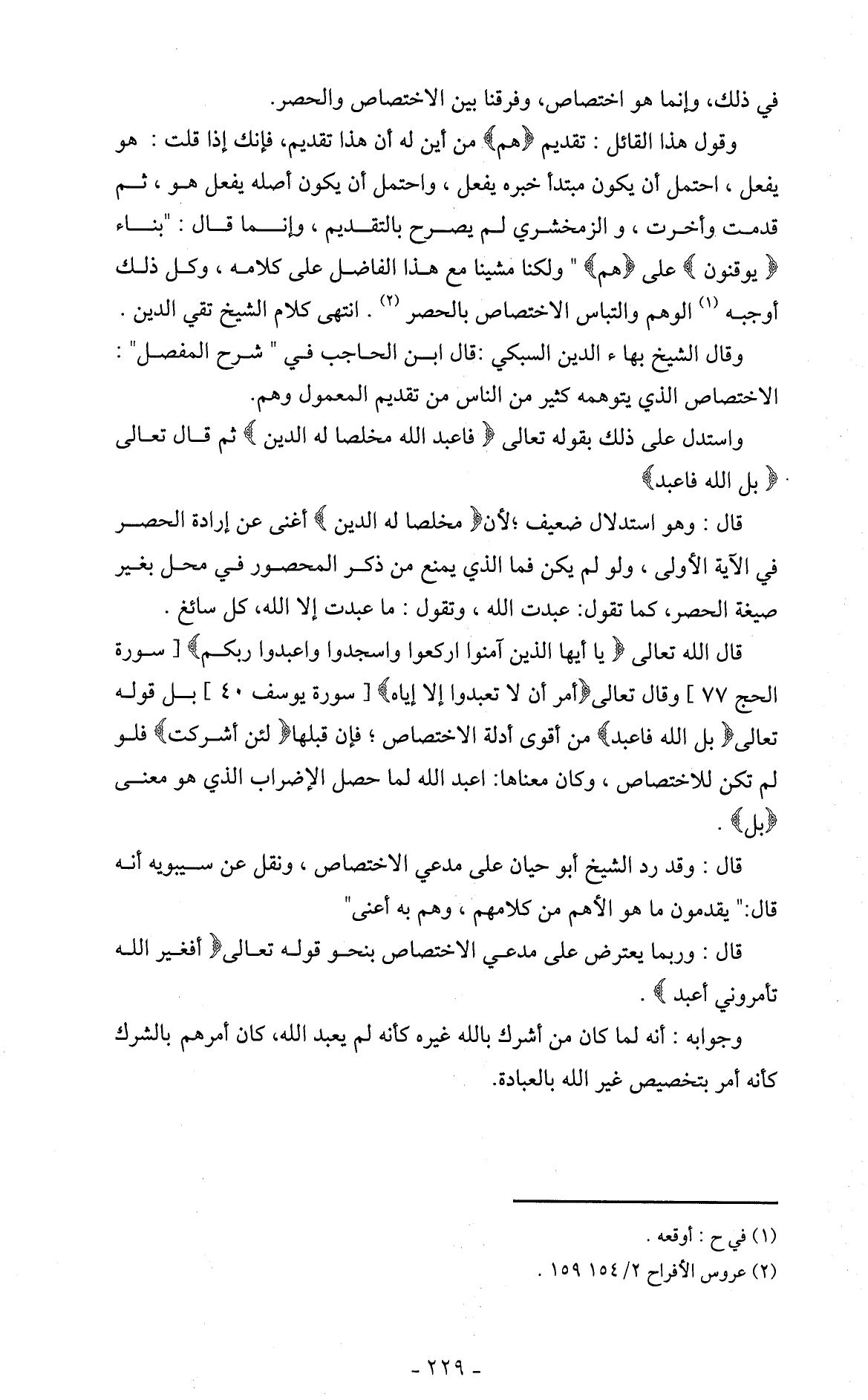 في ذلك، وإنما هو اختصاص، وفرقنا بين الاختصاص والحصر. وقول هذا القائل: تقديم (هم). من أين له أن هذا تقديم، فإنك إذا قلت: هو يفعل، احتمل أن يكون مبتدأ خبره يفعل، واحتمل أن يكون أصله يفعل هو، ثم قدمت وأخرت، والزمخشري لم يصرح بالتقديم، وإنما قال: " بناء (يوقنون) على (هم) " ولكنا مشينا مع هذا الفاضل على كلامه، وكل ذلك أوجبه (1) الوهم والتباس الاختصاص بالحصر (2). انتهى كلام الشيخ تقي الدين.