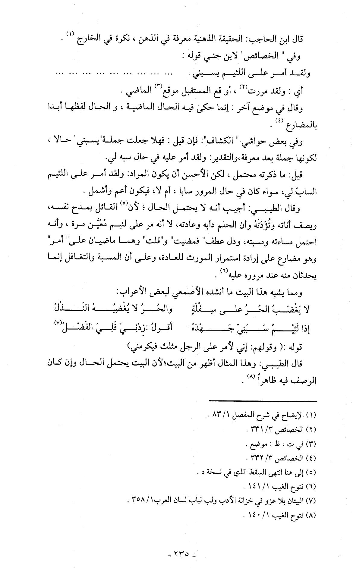وقال الطيبي: أجيب أنه لا يحتمل الحال؛ لأن (5) القائل يمدح نفسه، ويصف أناته وتُؤَدَتَهُ وأن الحلم دأبه وعادته، لا أنه مر على لئيم مُعُيَّن مرة، وأنه احتمل مساءته ومسبته، ودل عطف " فمضيت " و " قلت " وهما ماضيان على " أمر " وهو مضارع على إرادة استمرار المورث للعادة، وعلى أن المسبة والتغافل إنما يحدثان منه عند مروره عليه (6).