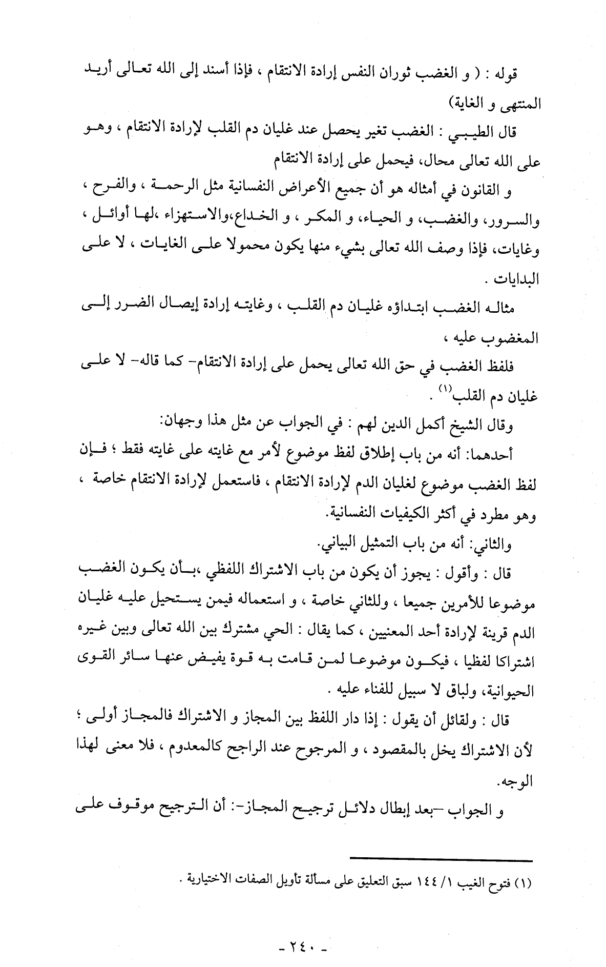 قال: وأقول: يجوز أن يكون من باب الاشتراك اللفظي، بأن يكون الغضب موضوعا للأمرين جميعا، وللثاني خاصة، واستعماله فيمن يستحيل عليه غليان الدم قرينة لإرادة أحد المعنيين، كما يقال: الحي مشترك بين الله تعالى وبين غيره اشتراكا لفظيا، فيكون موضوعا لمن قامت به قوة يفيض عنها سائر القوى الحيوانية، ولباق لا سبيل للفناء عليه.