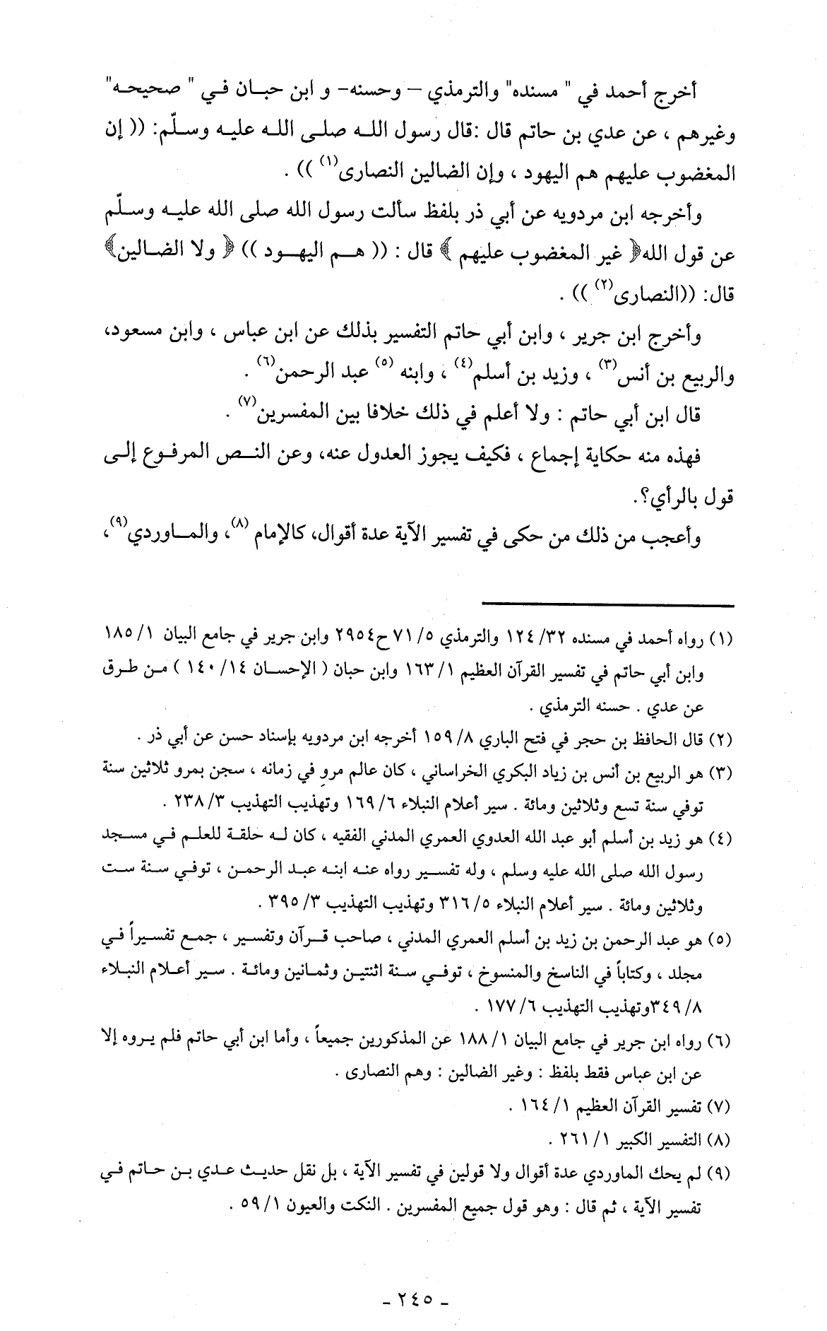 أخرج أحمد في " مسنده " والترمذي - وحسنه - وابن حبان في " صحيحه " وغيرهم، عن عدي بن حاتم قال: قال رسول الله صلى الله عليه وسلّم: " إن المغضوب عليهم هم اليهود، وإن الضالين النصارى (1) ".