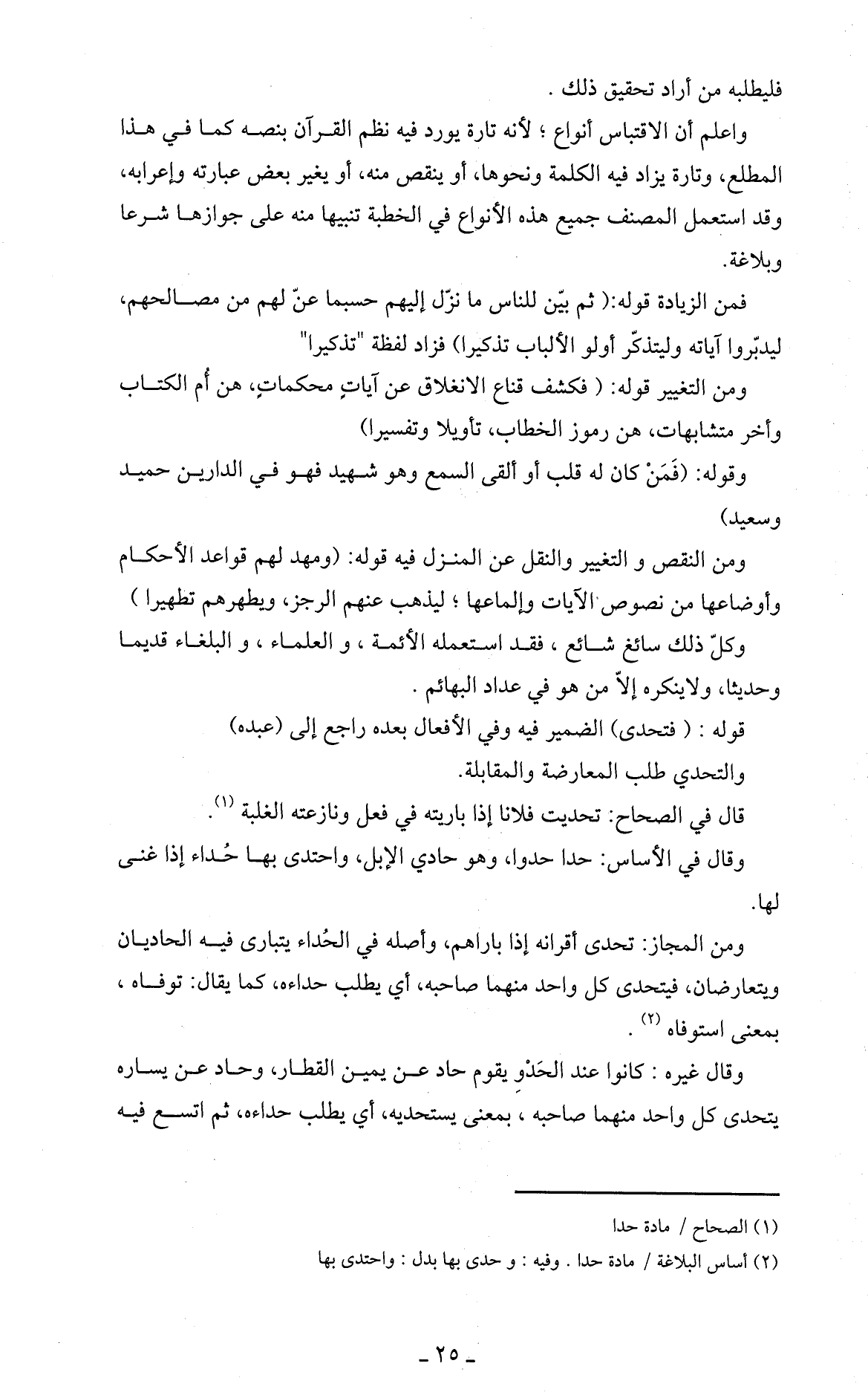 وقوله: (فَمَنْ كان له قلب أو ألقى السمع وهو شهيد فهو في الدارين حميد وسعيد) ومن النقص والتغيير والنقل عن المنزل فيه قوله: (ومهد لهم قواعد الأحكام وأوضاعها من نصوص الآيات وإلماعها؛ ليذهب عنهم الرجز، ويطهرهم تطهيرا) وكلّ ذلك سائغ شائع، فقد استعمله الأئمة، والعلماء، والبلغاء قديما وحديثا، ولا ينكره إلاّ من هو في عداد البهائم.