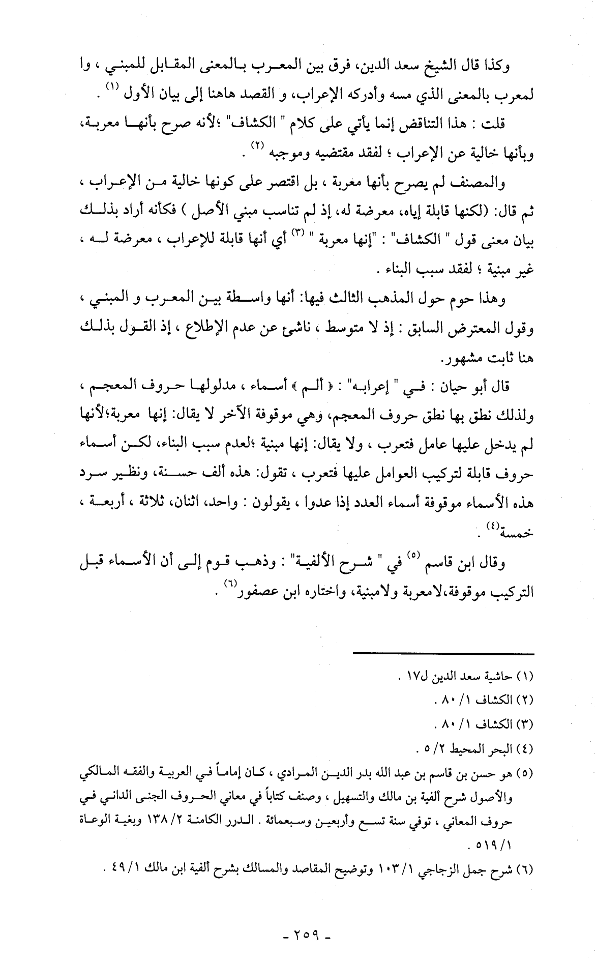 قلت: هذا التناقض إنما يأتي على كلام " الكشاف "؛ لأنه صرح بأنها معربة، وبأنها خالية عن الإعراب، لفقد مقتضيه وموجبه (3).