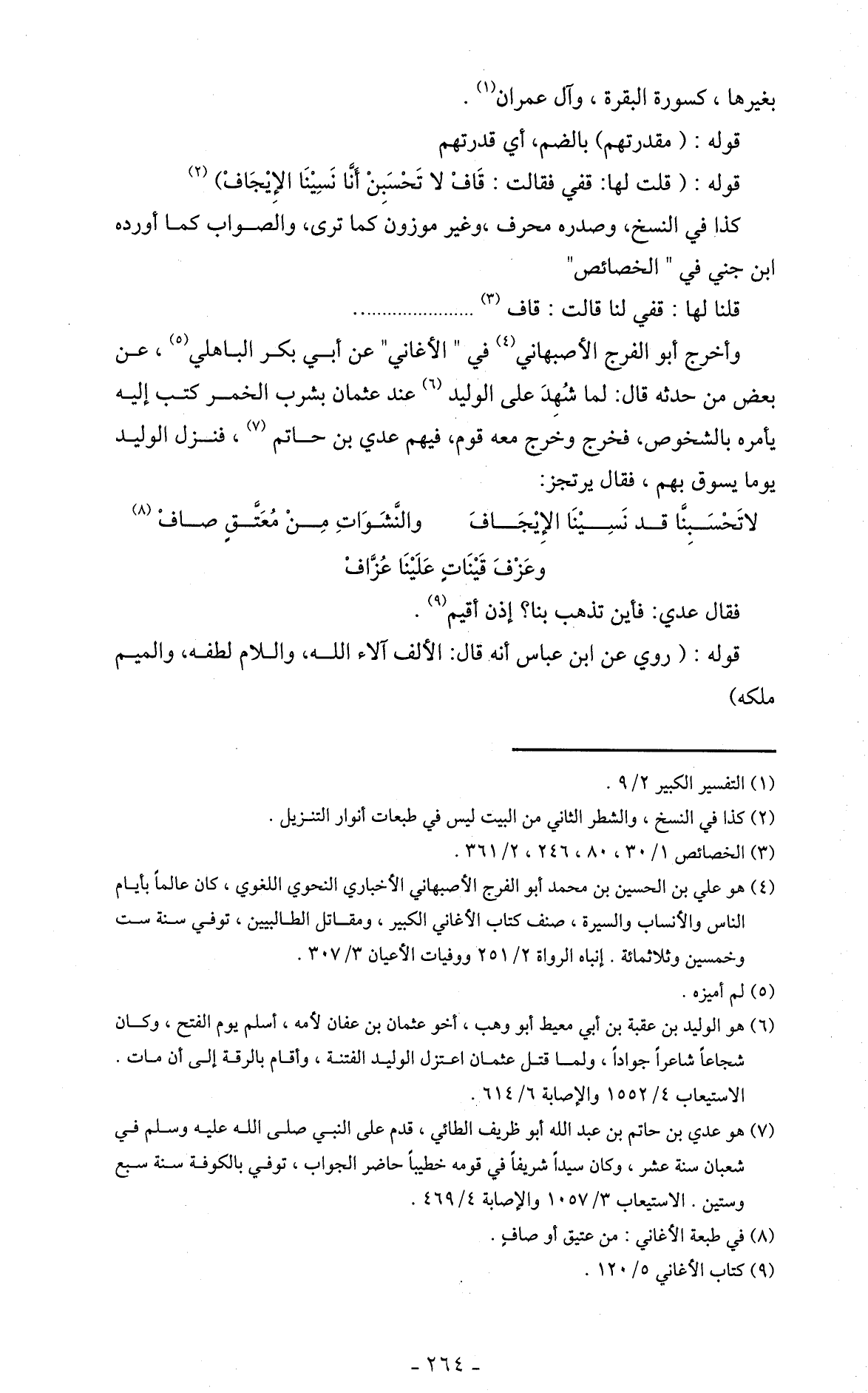 وأخرج أبو الفرج الأصبهاني في " الأغاني " عن أبي بكر الباهلي (5)، عن بعض من حدثه قال: لما شُهِدَ على الوليد (6) عند عثمان بشرب الخمر كتب إليه يأمره بالشخوص، فخرج وخرج معه قوم، فيهم عدي بن حاتم (7)، فنزل الوليد يوما يسوق بهم، فقال يرتجز: