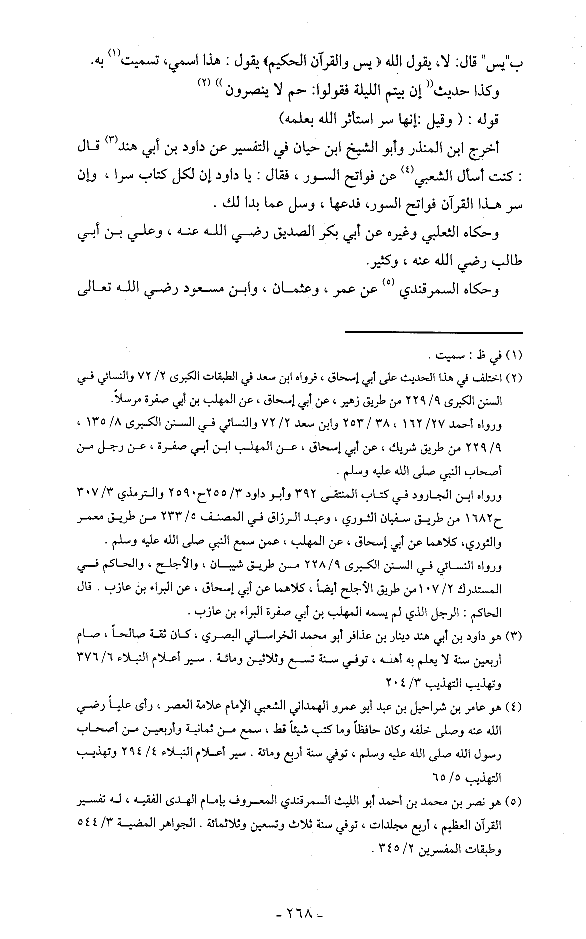 أخرج ابن المنذر وأبو الشيخ ابن حيان في التفسير عن داود بن أبي هند (3) قال: كنت أسال الشعبي (4) عن فواتح السور، فقال: يا داود إن لكل كتاب سرا، وإن سر هذا القرآن فواتح السور، فدعها، وسل عما بدا لك.