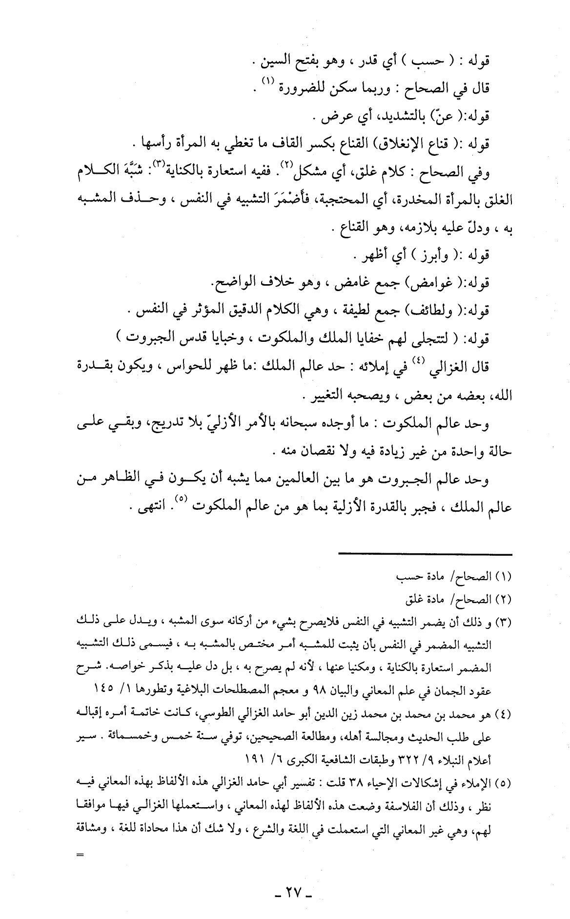 (5) الإملاء في إشكالات الإحياء 38 قلت: تفسير أبي حامد الغزالي هذه الألفاظ بهذه المعاني فيه نظر، وذلك أن الفلاسفة وضعت هذه الألفاظ لهذه المعاني، واستعملها الغزالي فيها موافقا لهم، وهي غير المعاني التي استعملت في اللغة والشرع، ولا شك أن هذا محاداة للغة، ومشاقة=