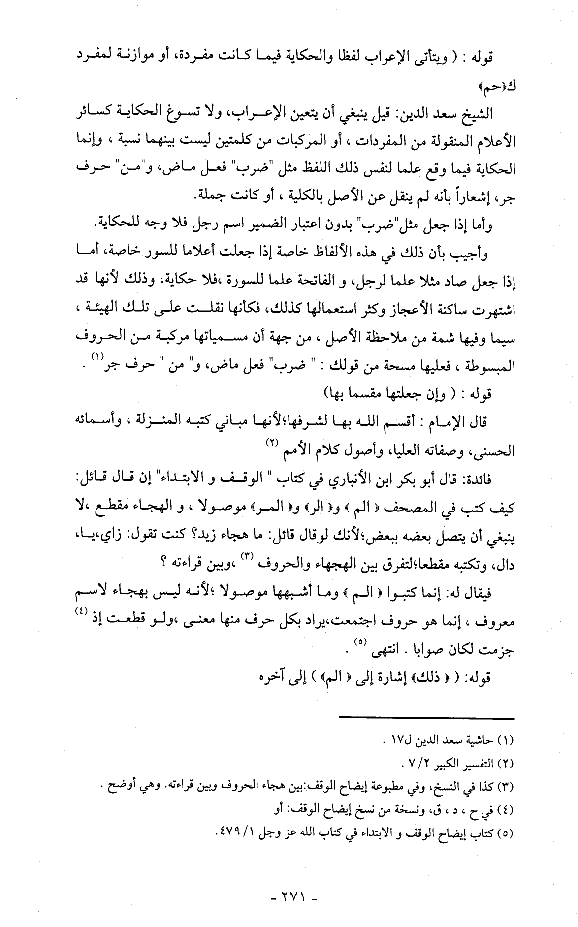 وأجيب بأن ذلك في هذه الألفاظ خاصة إذا جعلت أعلاما للسور خاصة، أما إذا جعل صاد مثلا علما لرجل، والفاتحة علما للسورة، فلا حكاية، وذلك لأنها قد اشتهرت ساكنة الأعجاز وكثر استعمالها كذلك، فكأنها نقلت على تلك الهيئة، سيما وفيها شمة من ملاحظة الأصل، من جهة أن مسمياتها مركبة من الحروف المبسوطة، فعليها مسحة من قولك: " ضرب " فعل ماض، و " من " حرف جر (1).