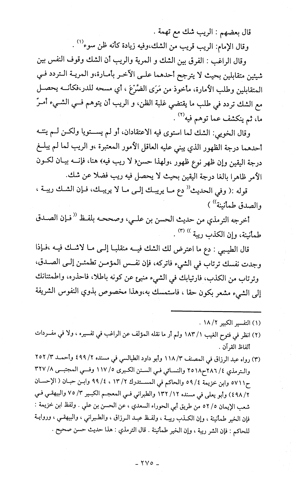 قوله: (وفي الحديث " دع ما يريبك إلى ما لا يريبك، فإن الشك ريبة، والصدق طمأنينة ")