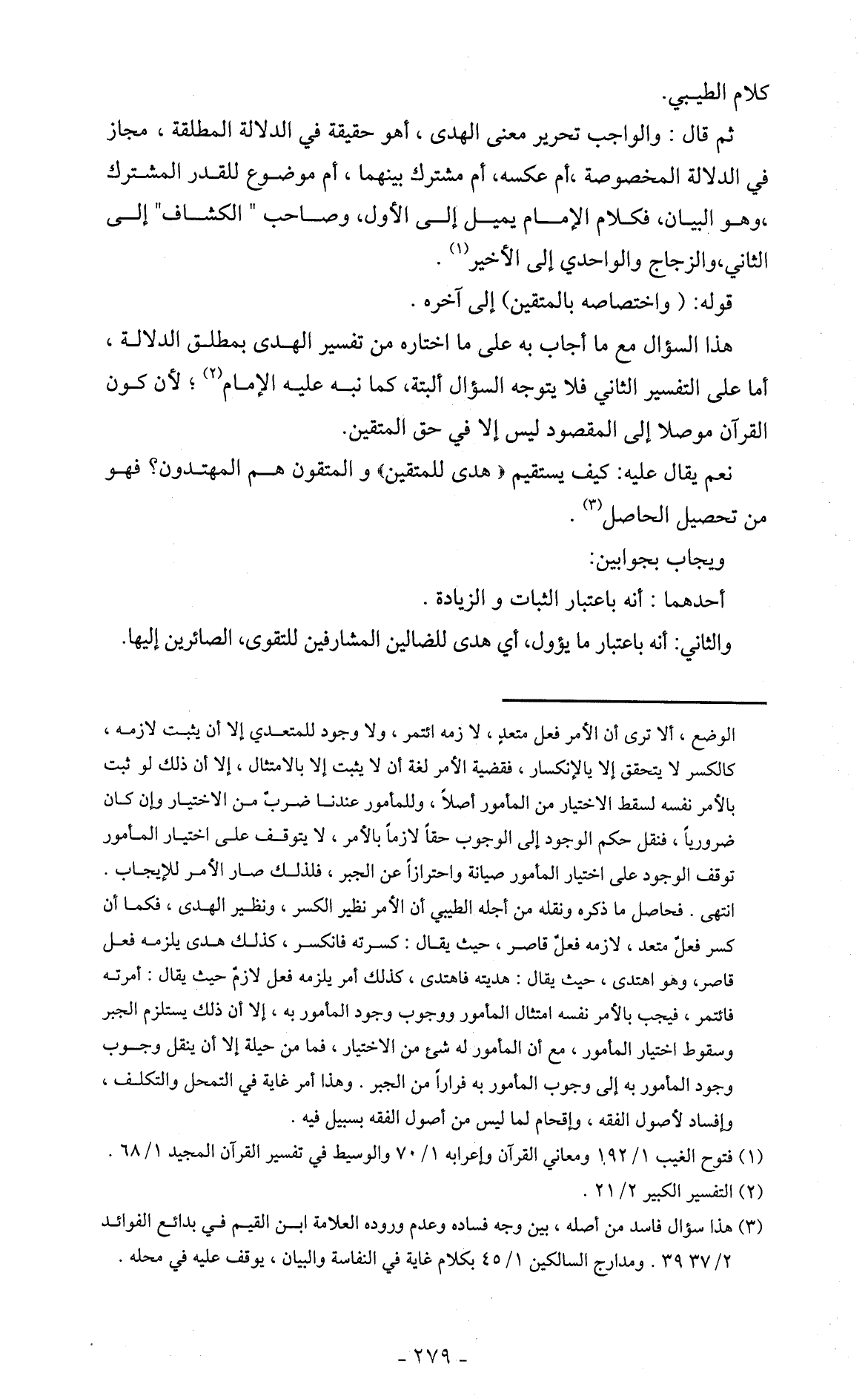 ثم قال: والواجب تحرير معنى الهدى، أهو حقيقة في الدلالة المطلقة، مجاز في الدلالة المخصوصة، أم عكسه، أم مشترك بينهما، أم موضوع للقدر المشترك، وهو البيان، فكلام الإمام يميل إلى الأول، وصاحب " الكشاف " إلى الثاني، والزجاج والواحدي إلى الأخير (1).