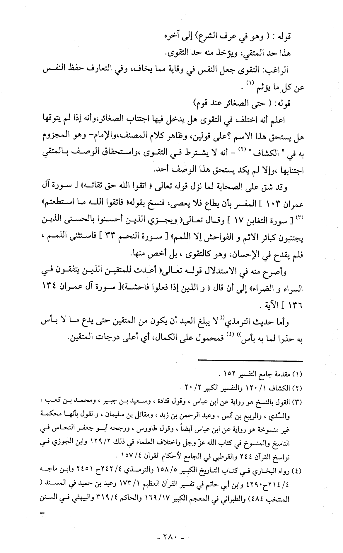 وقد شق على الصحابة لما نزل قوله تعالى (اتَّقُوا اللَّهَ حَقَّ تُقَاتِهِ) [سورة آل عمران 103] المفسر بأن يطاع فلا يعصى، فنسخ بقوله (فَاتَّقُوا اللَّهَ مَا اسْتَطَعْتُمْ) (3) [سورة التغابن 17] وقال تعالى (وَيَجْزِيَ الَّذِينَ أَحْسَنُوا بِالْحُسْنَى * الَّذِينَ يَجْتَنِبُونَ كَبَائِرَ الْإِثْمِ وَالْفَوَاحِشَ إِلَّا اللَّمَمَ) [سورة النجم 33] فاستثنى اللمم، فلم يقدح في الإحسان، وهو كالتقوى، بل أخص منها.