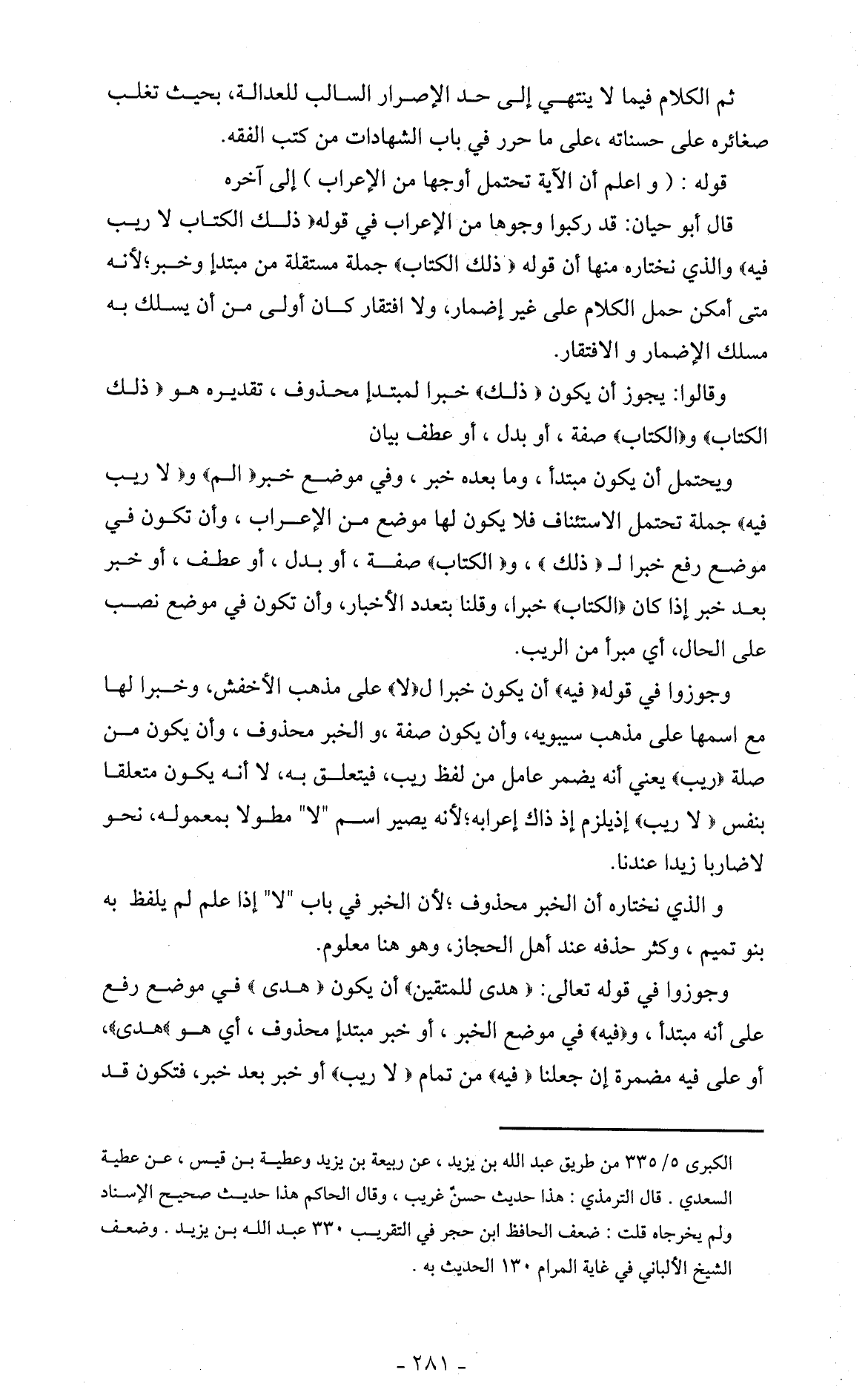 قال أبو حيان: قد ركبوا وجوها من الإعراب في قوله (ذلك الكتاب لا ريب فيه) والذي نختاره. منها أن قوله (" ذلك الكتاب) جملة مستقلة من مبتدإ وخبر؛ لأنه متى أمكن حمل الكلام على غير إضمار، ولا افتقار كان أولى من أن يسلك به مسلك الإضمار والافتقار.