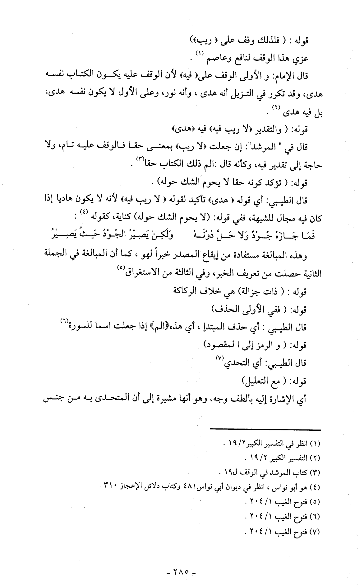 قال الإمام: والأولى الوقف على (فيه) لأن الوقف عليه يكون الكتاب نفسه هدى، وقد تكرر في التزيل أنه هدى، وأنه نور، وعلى الأول لا يكون نفسه هدى، بل فيه هدى (2).