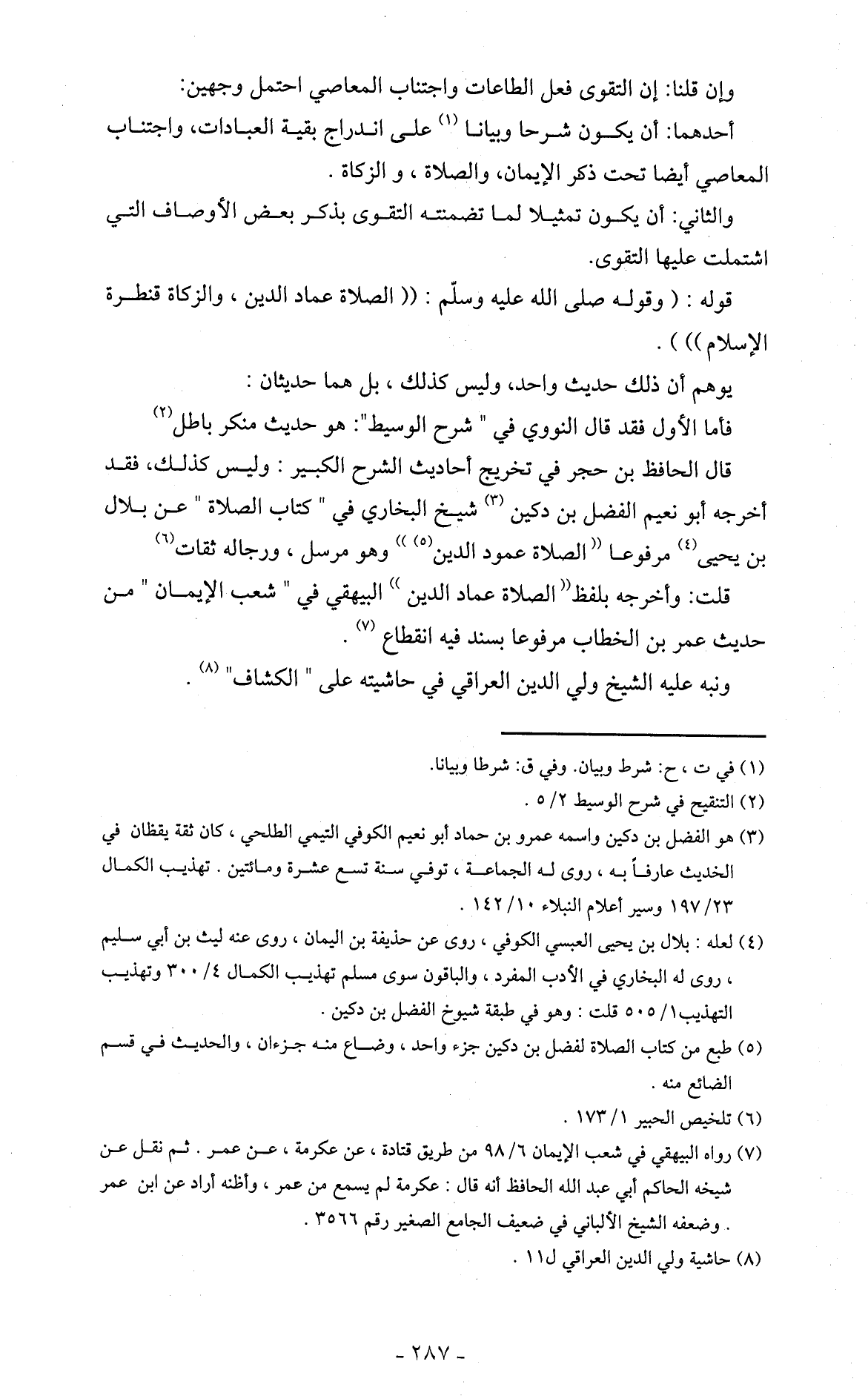 قلت: وأخرجه بلفظ " الصلاة عماد الدين " البيهقي في " شعب الإيمان " من حديث عمر بن الخطاب مرفوعا بسند فيه انقطاع (7).