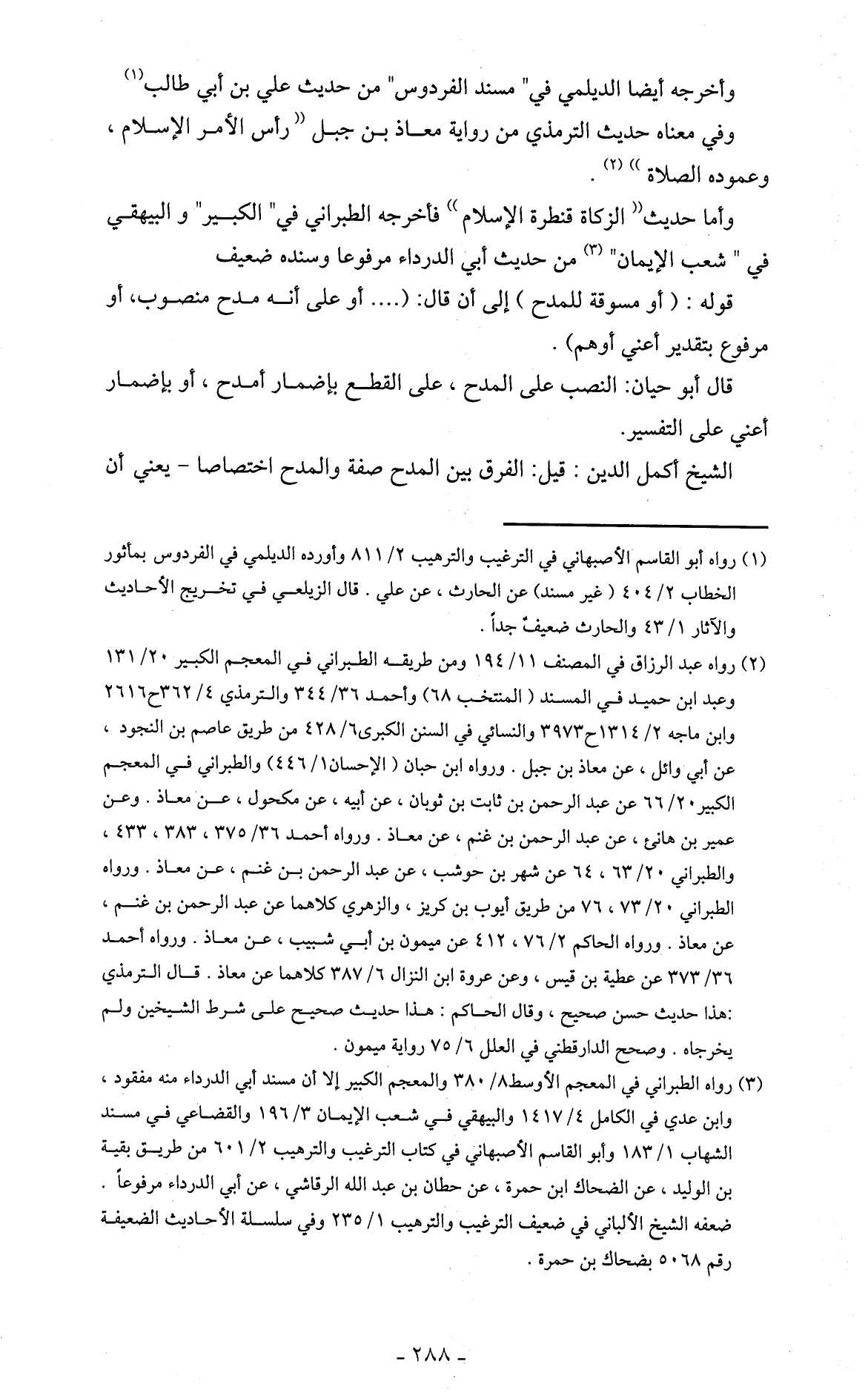 وأما حديث " الزكاة فنطرة الإسلام " فأخرجه الطبراني في " الكبير " والبيهقي في " شعب الإيمان " (3) من حديث أبي الدرداء مرفوعا وسنده ضعيف