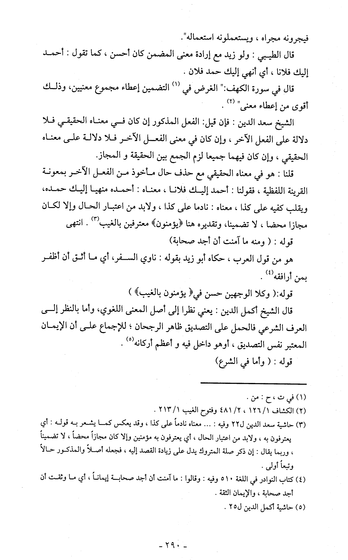 قلنا: هو في معناه الحقيقي مع حذف حال مأخوذ من الفعل الآخر بمعونة القرينة اللفظية، فقولنا: أحمد إليك فلانا، معناه: أحمده منهيا إليك حمده، ويقلب كفيه على كذا، معناه: نادما على كذا، ولابد من اعتبار الحال وإلا لكان مجازا محضا، لا تضمينا، وتقديره هنا (يؤمنون) معترفين بالغيب (3). انتهى