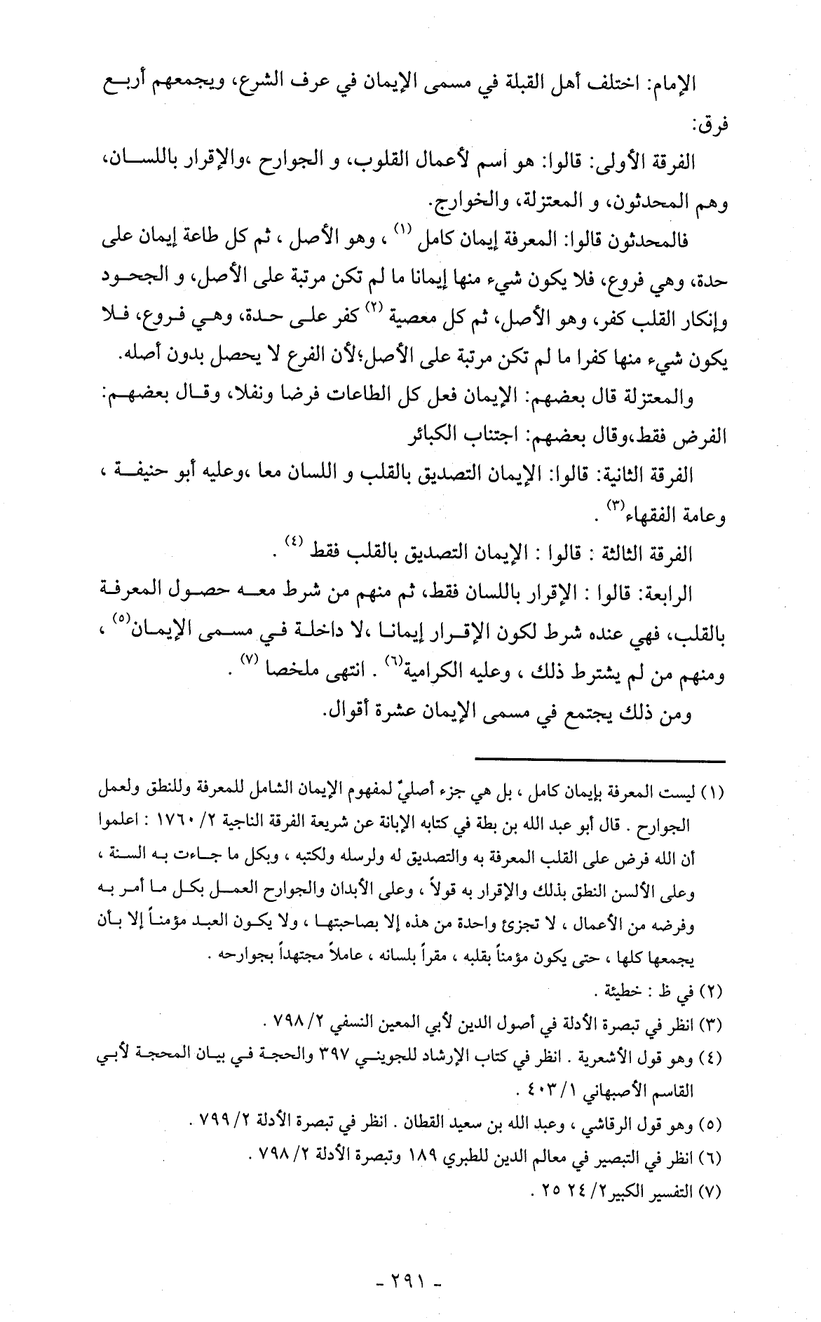 الإمام: اختلف أهل القبلة في مسمى الإيمان في عرف الشرع، ويجمعهم أربع فرق: