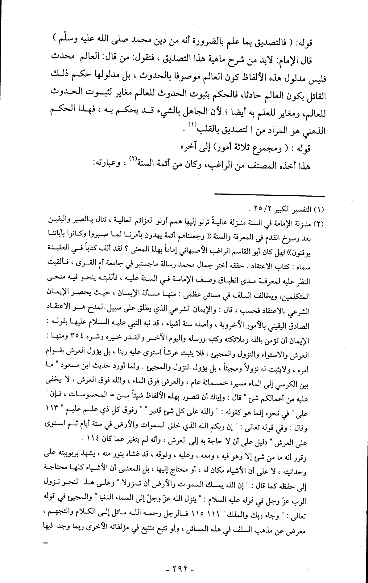 قوله: (فالتصديق بما علم بالضرورة أنه من دين محمد صلى الله عليه وسلّم) قال الإمام: لابد من شرح ماهية هذا التصديق، فنقول: من قال: العالم محدث فليس مدلول هذه الألفاظ كون العالم موصوفا بالحدوث، بل مدلولها حكم ذلك القائل بكون العالم حادثا، فالحكم بثبوت الحدوث للعالم مغاير لثبوت الحدوث للعالم، ومغاير للعلم به أيضاً؛ لأن الجاهل بالشيء قد يحكم به، فهذا الحكم الذهني هو المراد من التصديق بالقلب. (1)