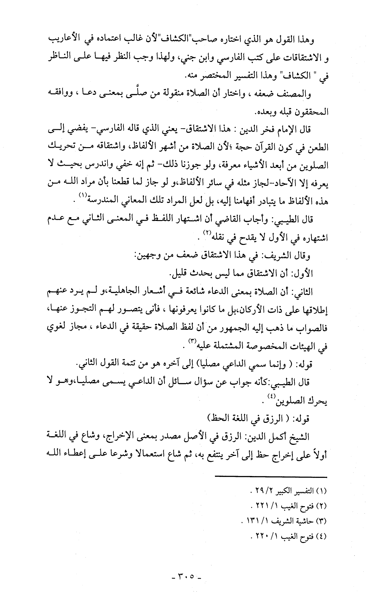 قال الإمام فخر الدين: هذا الاشتقاق - يعني الذي قاله الفارسي - يفضي إلى الطعن في كون القرآن حجة؛ لأن الصلاة من أشهر الألفاظ، واشتقاقه من تحريك الصلوين من أبعد الأشياء معرفة، ولو جوزنا ذلك - ثم إنه خفي واندرس بحيث لا يعرفه إلا الآحاد - لجاز مثله في سائر الألفاظ، ولو جاز لما قطعنا بأن مراد الله من هذه الألفاظ ما يتبادر أفهامنا إليه، بل لعل المراد تلك المعاني المندرسة (1).