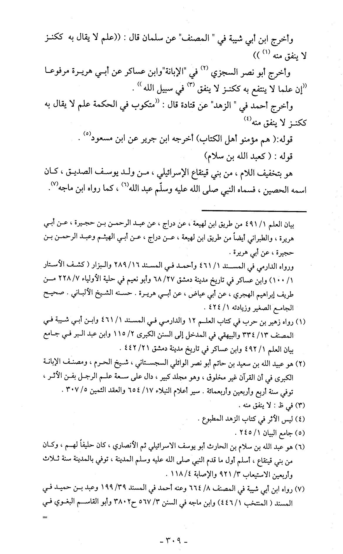 وأخرج أبو نصر السجزي (2) في " الإبانة " وابن عساكر عن أبي هريرة مرفوعا " إن علما لا ينتفع به ككنز لا ينفق (3) في سبيل الله ".