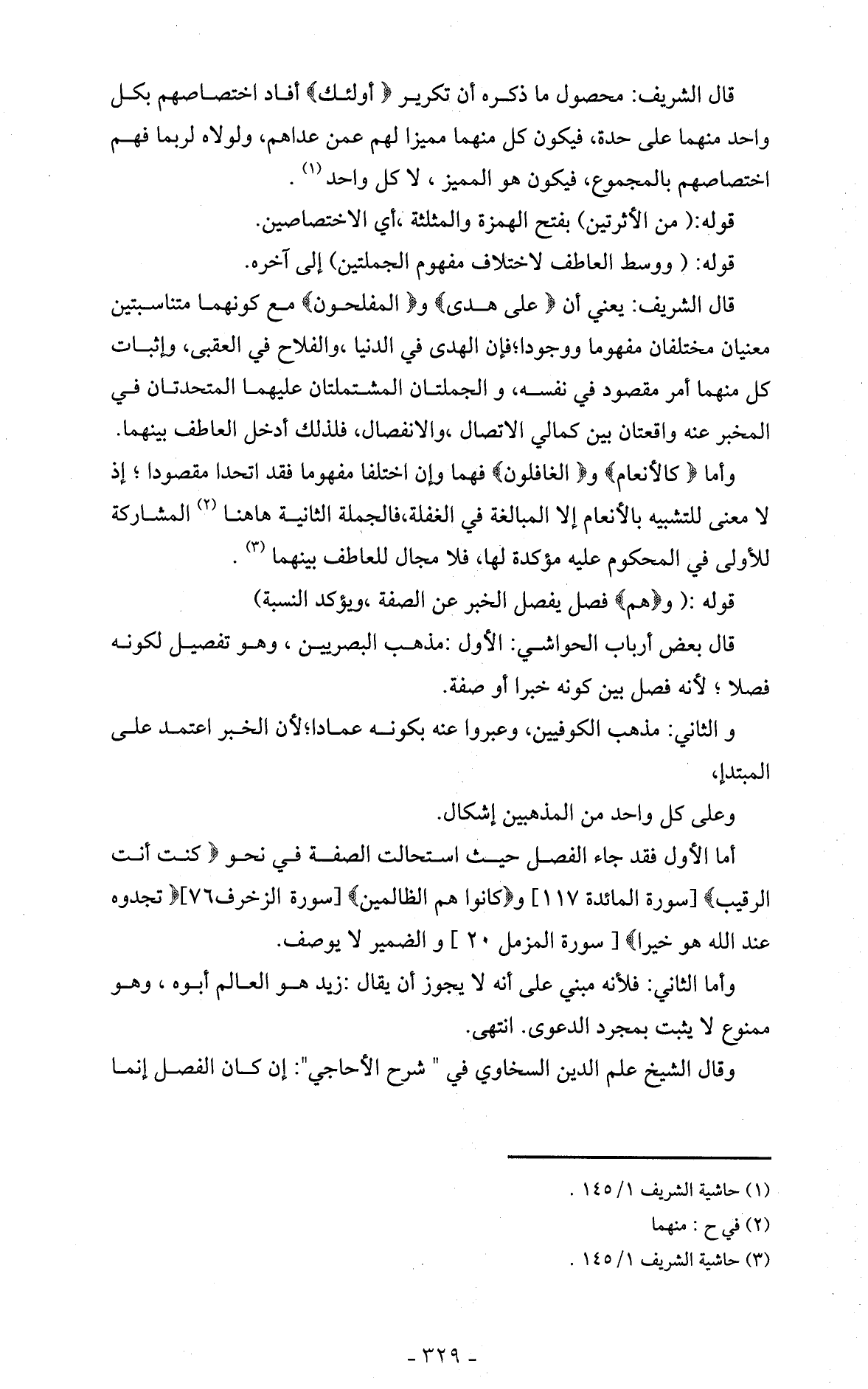 قال الشريف: يعني أن (على هدى) و (المفلحون) مع كونهما متناسبتين معنيان مختلفان مفهوما ووجودا؛ فإن الهدى في الدنيا، والفلاح في العقبى، وإثبات كل منهما أمر مقصود في نفسه، والجملتان المشتملتان عليهما المتحدتان في المخبر عنه واقعتان بين كمالي الاتصال، والانفصال، فلذلك أدخل العاطف بينهما.