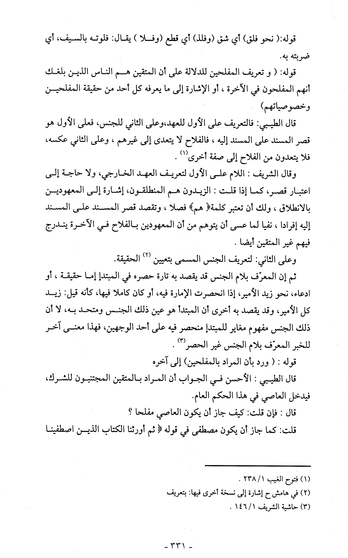 قال الطيبي: فالتعريف على الأول للعهد، وعلى الثاني للجنس، فعلى الأول هو قصر المسند على المسند إليه، فالفلاح لا يتعدى إلى غيرهم، وعلى الثاني عكسه، فلا يتعدون من الفلاح إلى صفة أخرى (1).