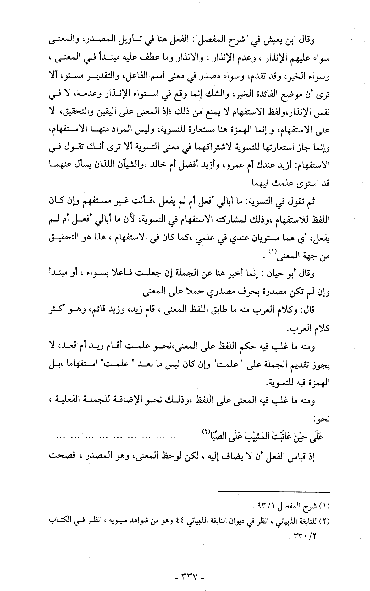 ثم تقول في التسوية: ما أبالي أفعل أم لم يفعل، فأنت غير مستفهم وإن كان اللفظ للاستفهام، وذلك لمشاركته الاستفهام في التسوية؛ لأن ما أبالي أفعل أم لم يفعل، أي هما مستويان عندي في علمي، كما كان في الاستفهام، هذا هو التحقيق من جهة المعنى (1).