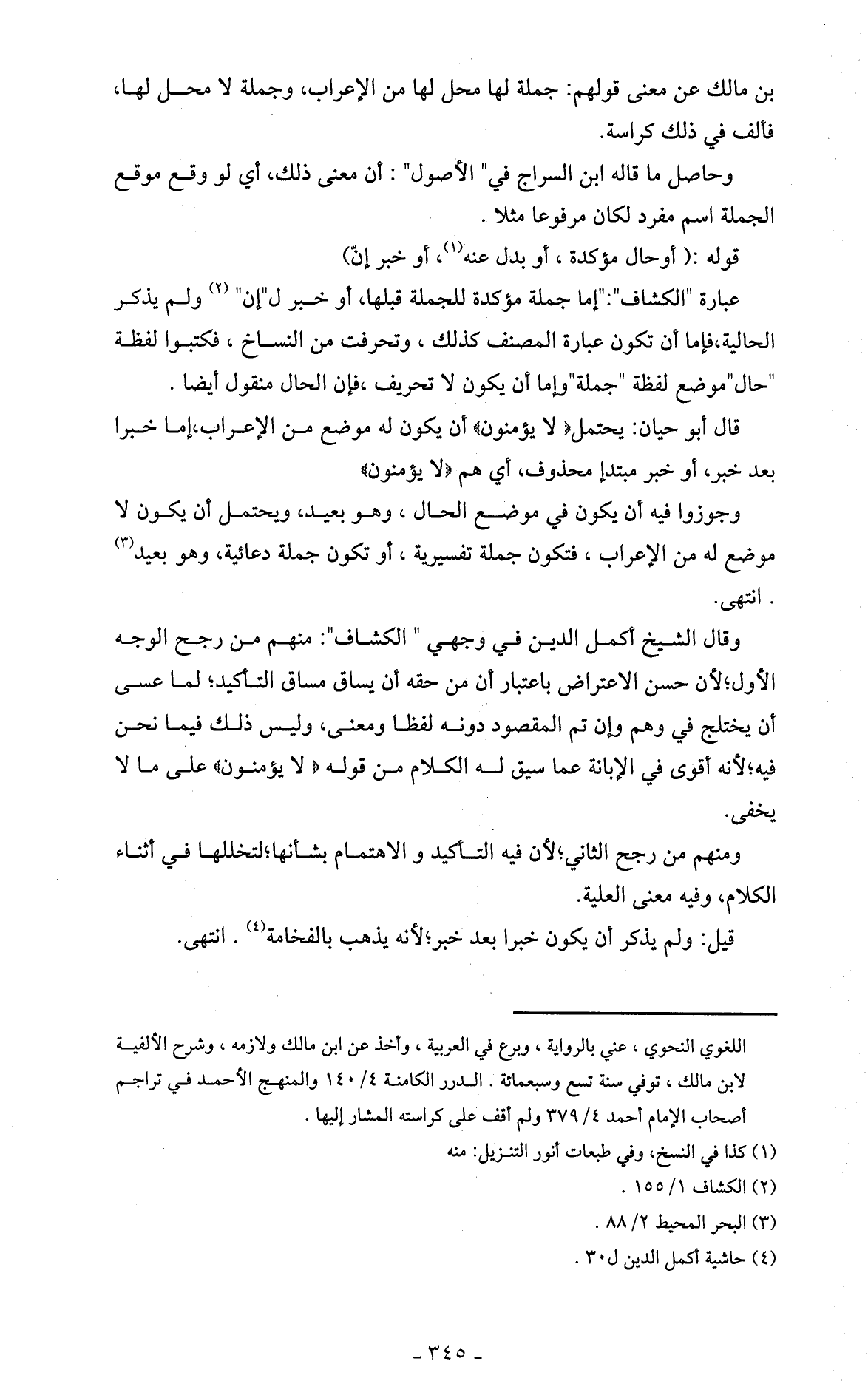 عبارة " الكشاف ": " إما جملة مؤكدة للجملة قبلها، أو خبر لـ " إن " (2) ولم يذكر الحالية، فإما أن تكون عبارة المصنف كذلك، وتحرفت من النساخ، فكتبوا لفظة " حال " موضع لفظة " جملة " وإما أن يكون لا تحريف، فإن الحال منقول أيضاً.