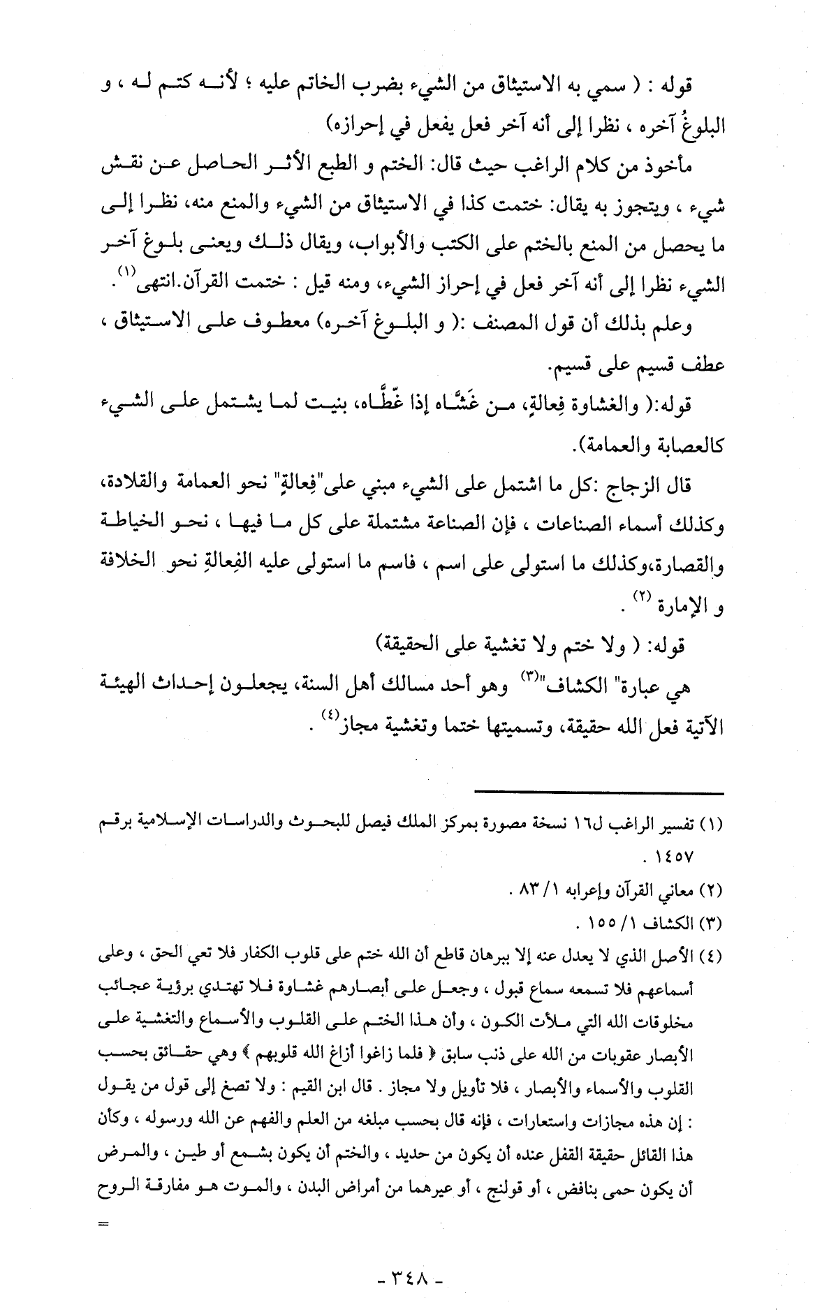 هي عبارة " الكشاف " (3) وهو أحد مسالك أهل السنة، يجعلون إحداث الهيئة الآتية فعل الله حقيقة، وتسميتها ختما وتغشية مجاز (4).