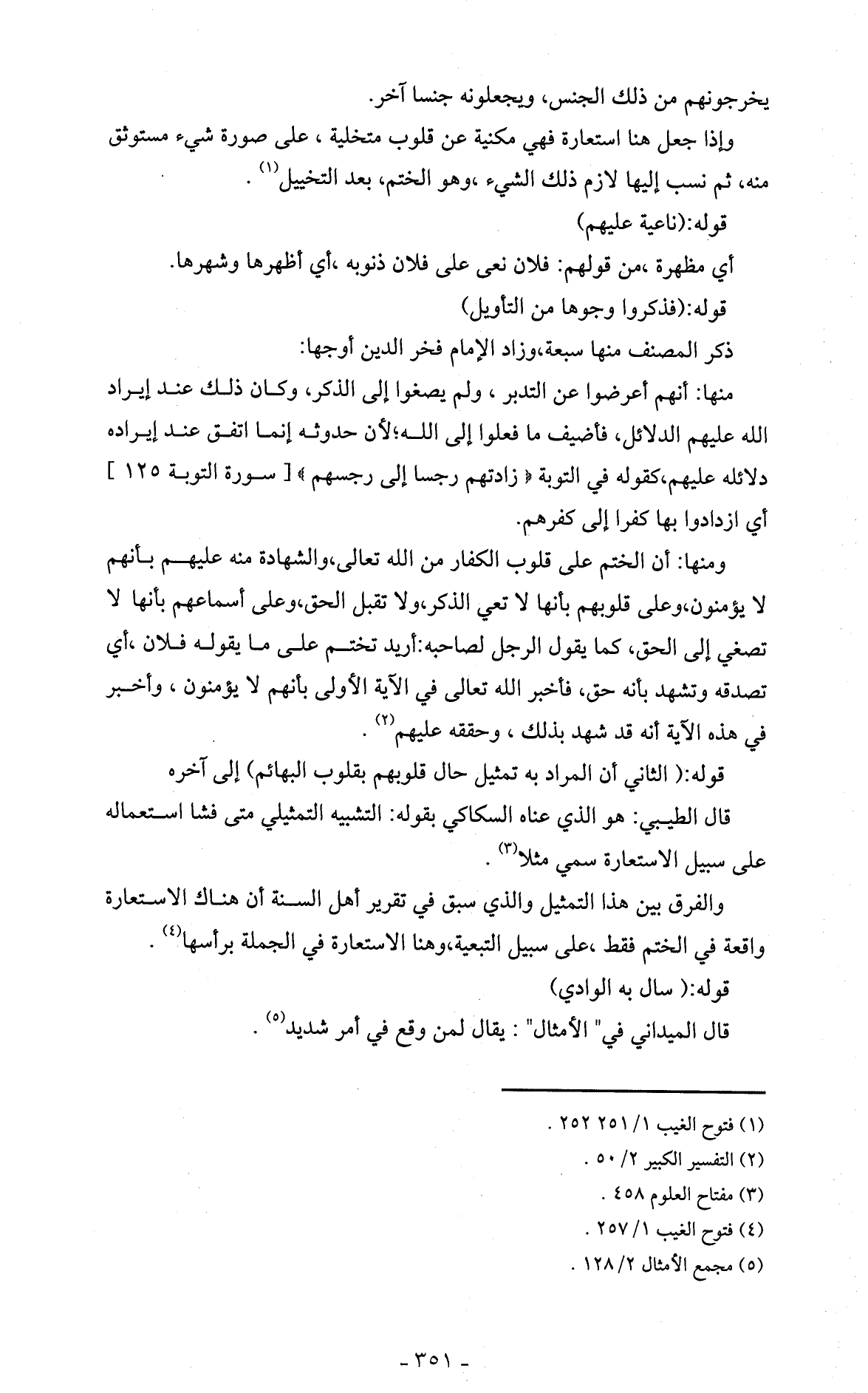 والفرق بين هذا التمثيل والذي سبق في تقرير أهل السنة أن هناك الاستعارة واقعة في الختم فقط، على سبيل التبعية، وهنا الاستعارة في الجملة برأسها (4).