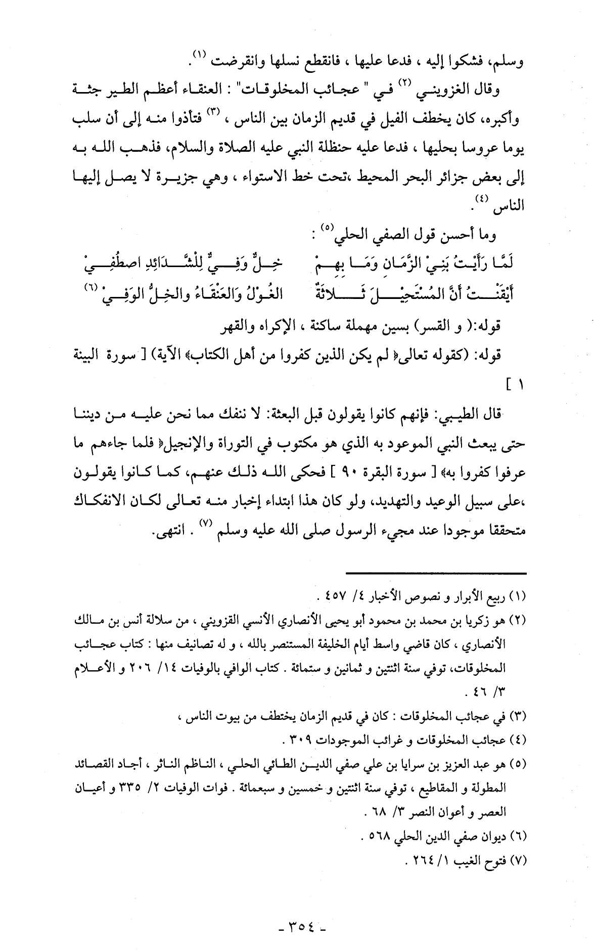 وقال الغزويني (2) في " عجائب المخلوقات ": العنقاء أعظم الطير جثة وأكبره، كان يخطف الفيل في قديم الزمان بين الناس (3)، فتأذوا منه إلى أن سلب يوما عروسا بحليها، فدعا عليه حنظلة النبي عليه الصلاة والسلام، فذهب الله به إلى بعض جزائر البحر المحيط، تحت خط الاستواء، وهي جزيرة لا يصل إليها الناس (4).