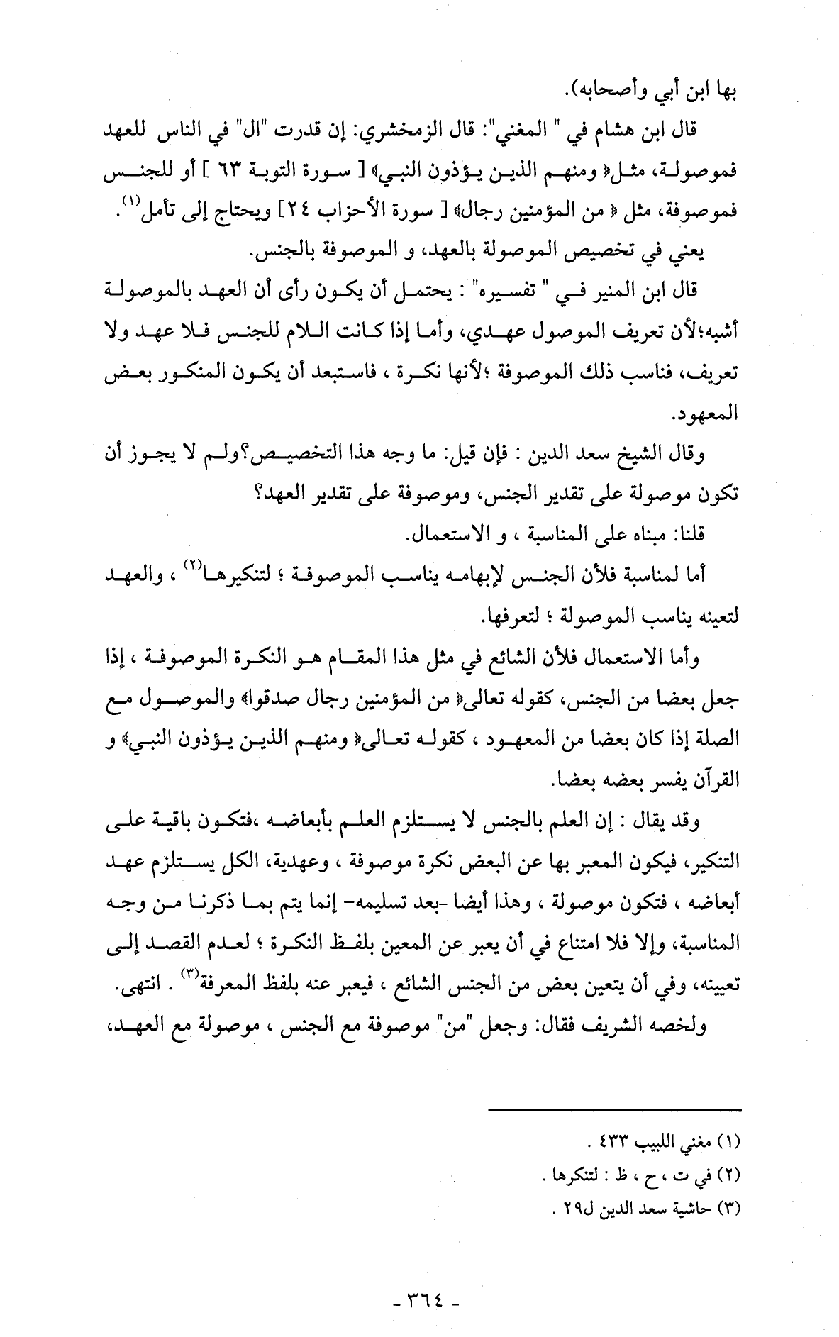 وقد يقال: إن العلم بالجنس لا يستلزم العلم بأبعاضه، فتكون باقية على التنكير، فيكون المعبر بها عن البعض نكرة موصوفة، وعهدية، الكل يستلزم عهد أبعاضه، فتكون موصولة، وهذا أيضاً - بعد تسليمه - إنما يتم بما ذكرنا من وجه المناسبة، وإلا فلا امتناع في أن يعبر عن المعين بلفظ النكرة؛ لعدم القصد إلى تعيينه، وفي أن يتعين بعض من الجنس الشائع، فيعبر عنه بلفظ المعرفة (3). انتهى.