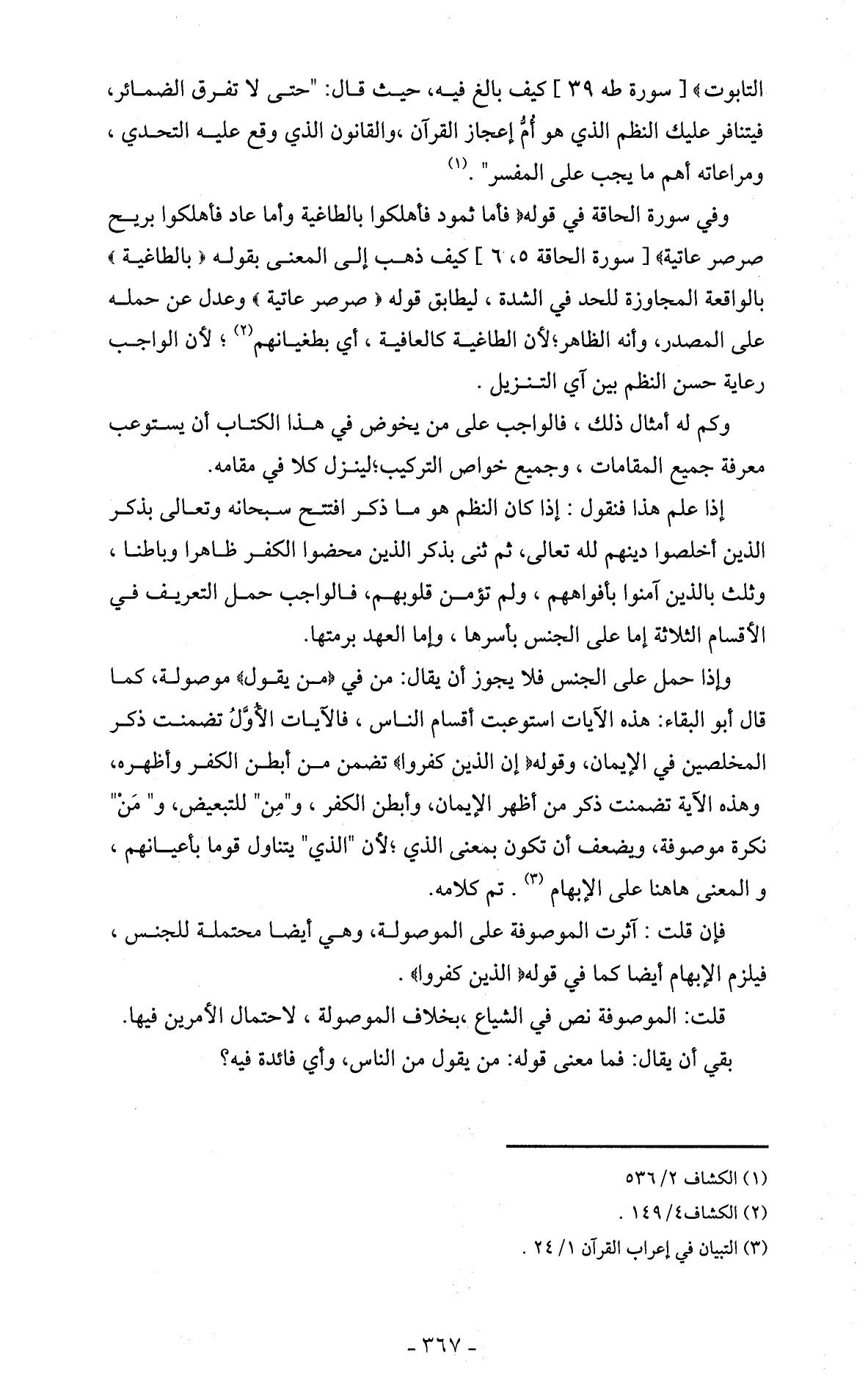 إذا علم هذا فنقول: إذا كان النظم هو ما ذكر افتتح سبحانه وتعالى بذكر الذين أخلصوا دينهم لله تعالى، ثم ثنى بذكر الذين محضوا الكفر ظاهرا وباطنا، وثلث بالذين آمنوا بأفواههم، ولم تؤمن قلوبهم، فالواجب حمل التعريف في الأقسام الثلاثة إما على الجنس بأسرها، وإما العهد برمتها.