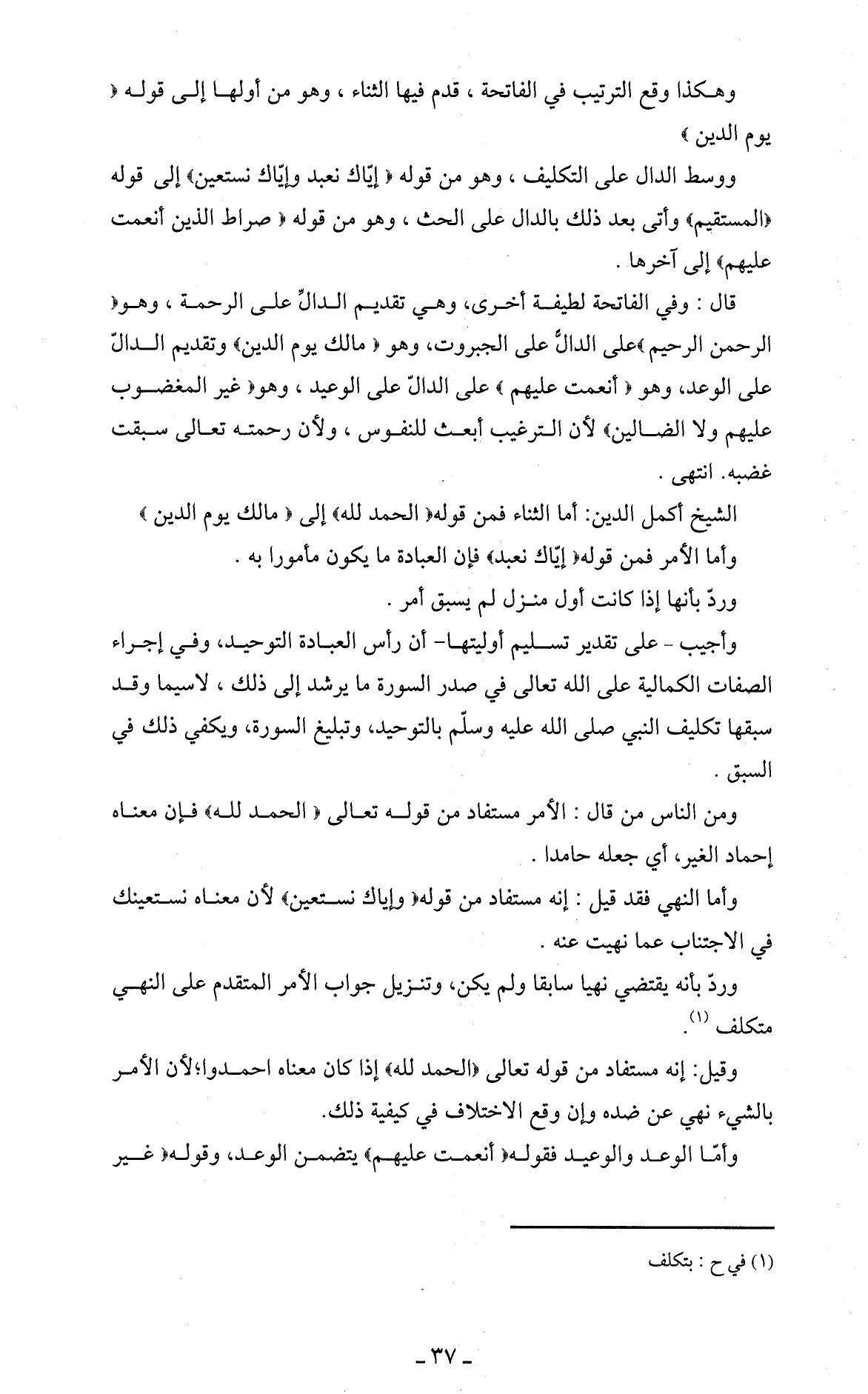 الشيخ أكمل الدين: أما الثناء فمن قوله (الحمد لله) إلى (مالك يوم الدين) وأما الأمر فمن قوله (إيَّاك نعبد) فإن العبادة ما يكون مأمورا به.