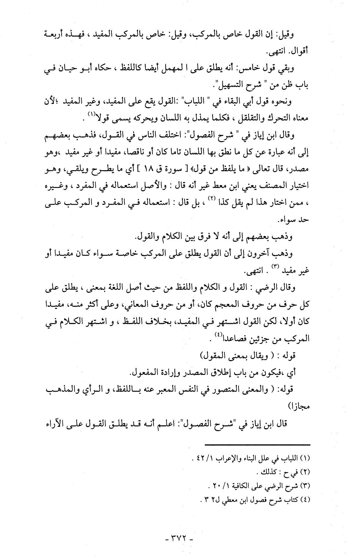 وقال ابن إياز في " شرح الفصول ": اختلف الناس في القول، فذهب بعضهم إلى أنه عبارة عن كل ما نطق بها اللسان تاما كان أو ناقصا، مفيدا أو غير مفيد، وهو مصدر، قال تعالى (ما يلفظ من قول) [سورة ق 18] أي ما يطرح ويلقي، وهو اختيار المصنف يعني ابن معط غير أنه قال: والأصل استعماله في المفرد، وغيره، ممن اختار هذا لم يقل كذا (2)، بل قال: استعماله في المفرد والمركب على حد سواء.