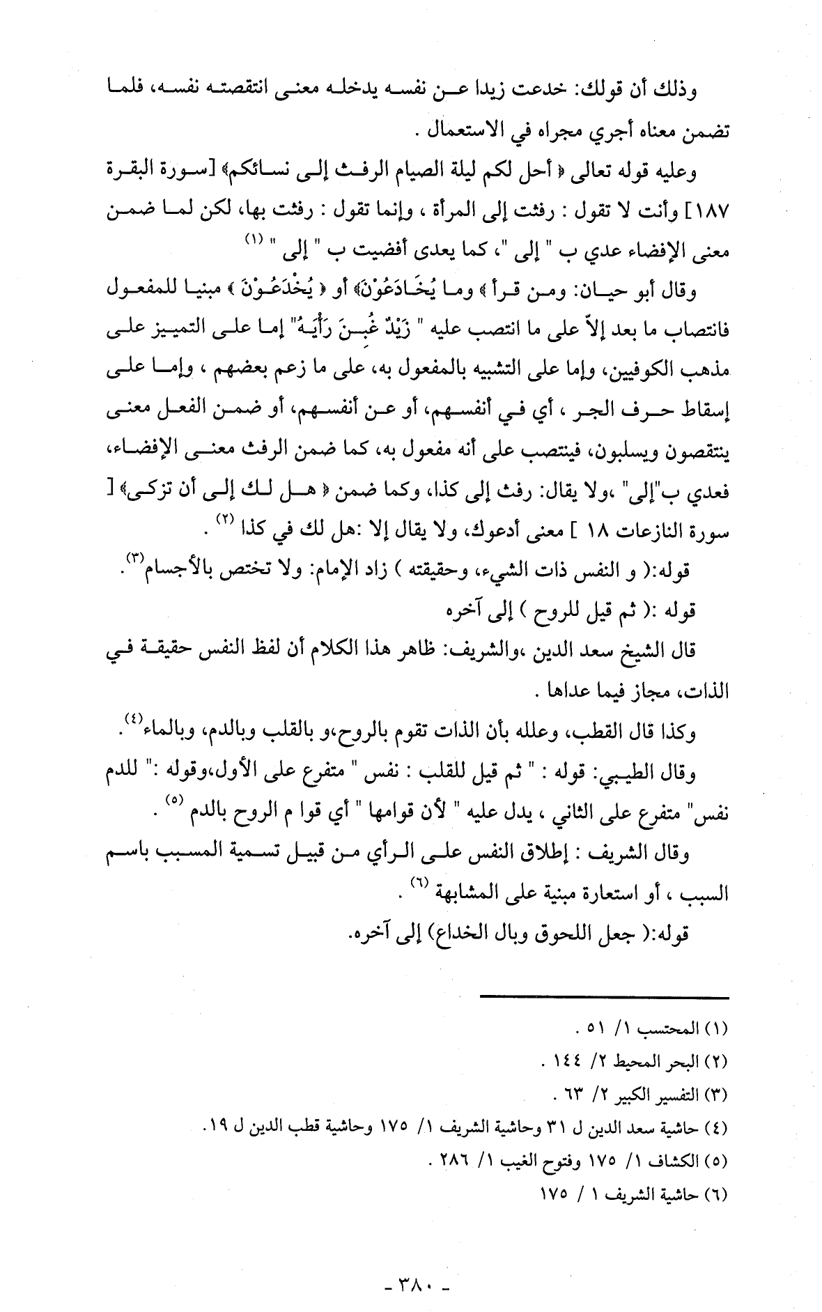 وقال الشريف: إطلاق النفس على الرأي من قبيل تسمية المسبب باسم السبب، أو استعارة مبنية على المشابهة (6).