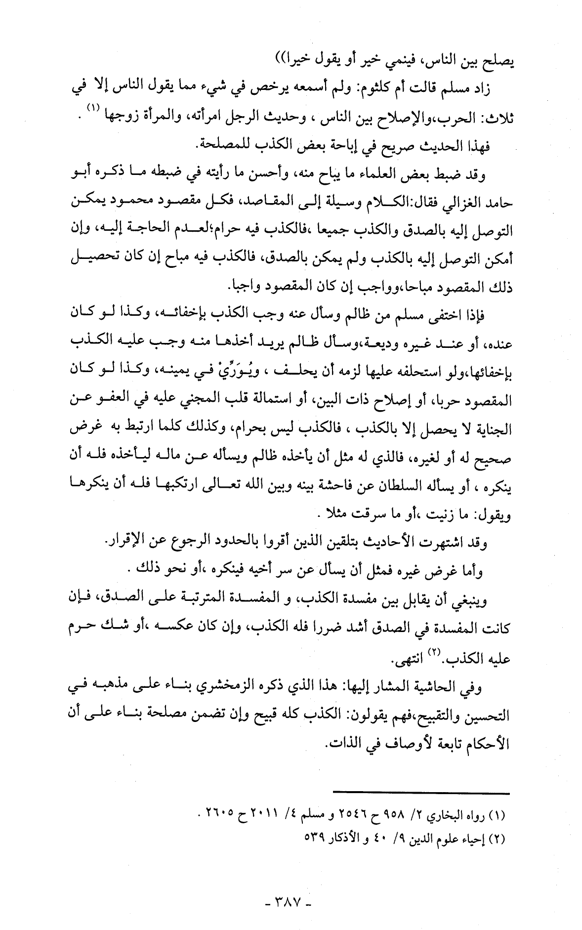 زاد مسلم قالت أم كلثوم: ولم أسمعه يرخص في شيء مما يقول الناس إلا في ثلاث: الحرب، والإصلاح بين الناس، وحديث الرجل امرأته، والمرأة زوجها (1).