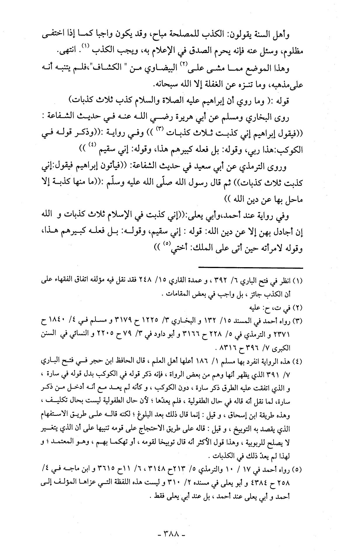 روى البخاري ومسلم عن أبي هريرة رضي الله عنه في حديث الشفاعة: " فيقول إبراهيم إني كذبت ثلاث كذبات (3) " وفي رواية: " وذكر قوله في الكوكب: هذا ربي، وقوله: بل فعله كبيرهم هذا، وقوله: إني سقيم (4) "