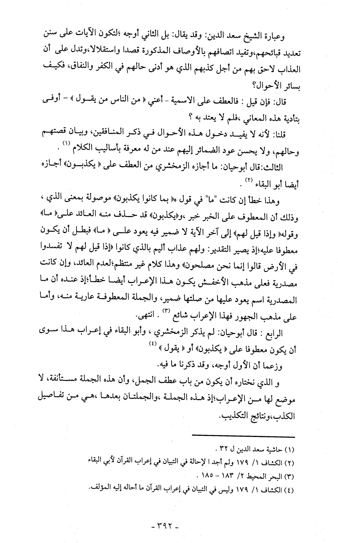 وعبارة الشيخ سعد الدين: وقد يقال: بل الثاني أوجه؛ لتكون الآيات على سنن تعديد قبائحهم، وتفيد اتصافهم بالأوصاف المذكورة قصدا واستقلالا، وتدل على أن العذاب لاحق بهم من أجل كذبهم الذي هو أدنى حالهم في الكفر والنفاق، فكيف بسائر الأحوال؟