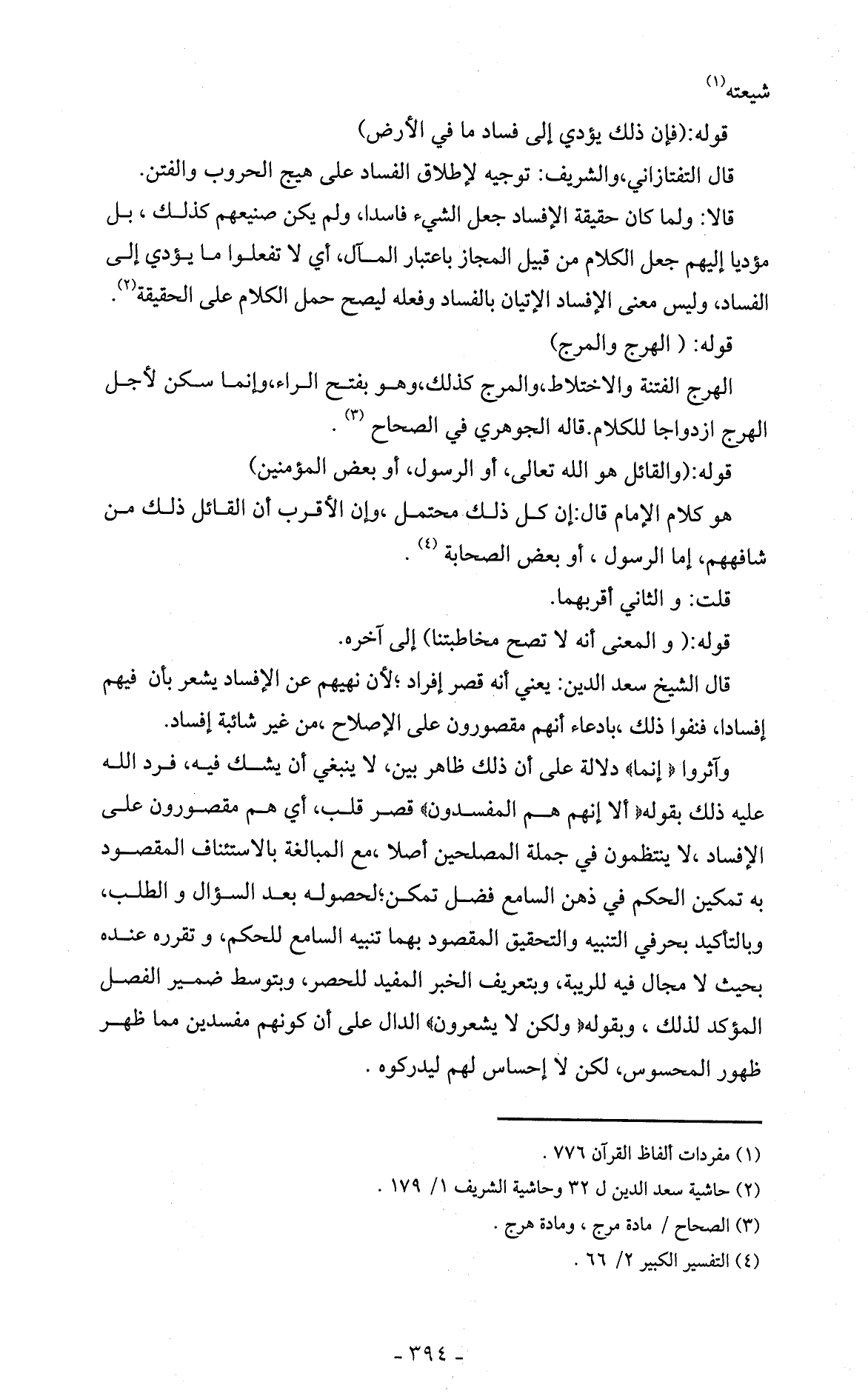 قال التفتازاني، والشريف: توجيه لإطلاق الفساد على هيج الحروب والفتن.
